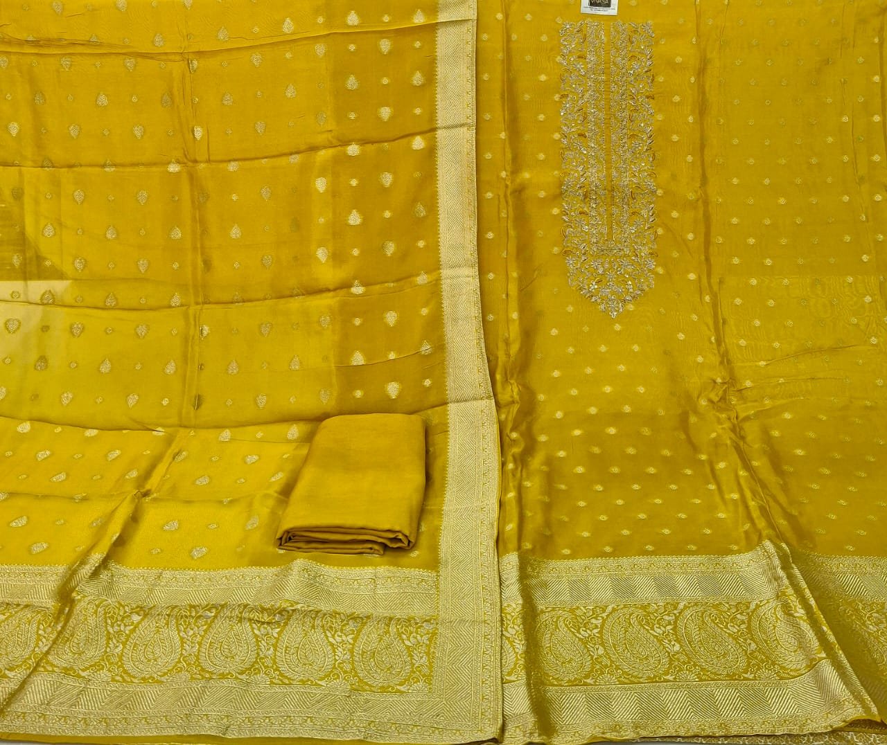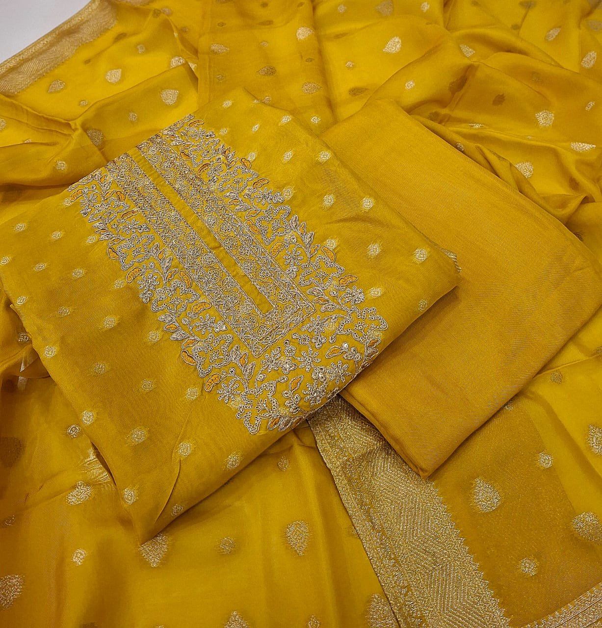 Banarasi silk fabric full suit banarasi weaving design with plane bottom and banarasi silk dupatta.