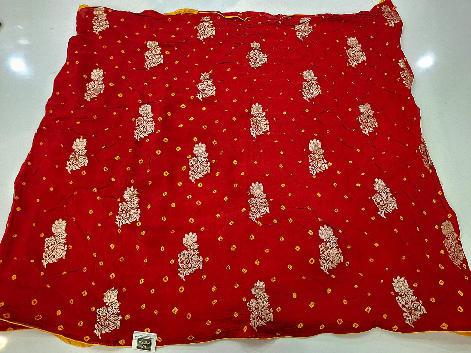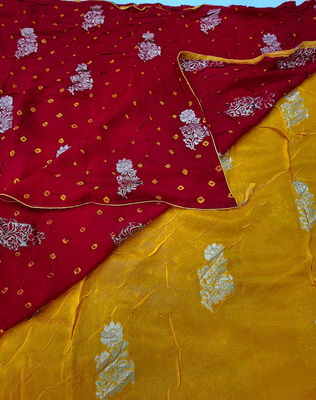 Dola silk fabric bandhej style saree with contrast bandhej silk blouse.