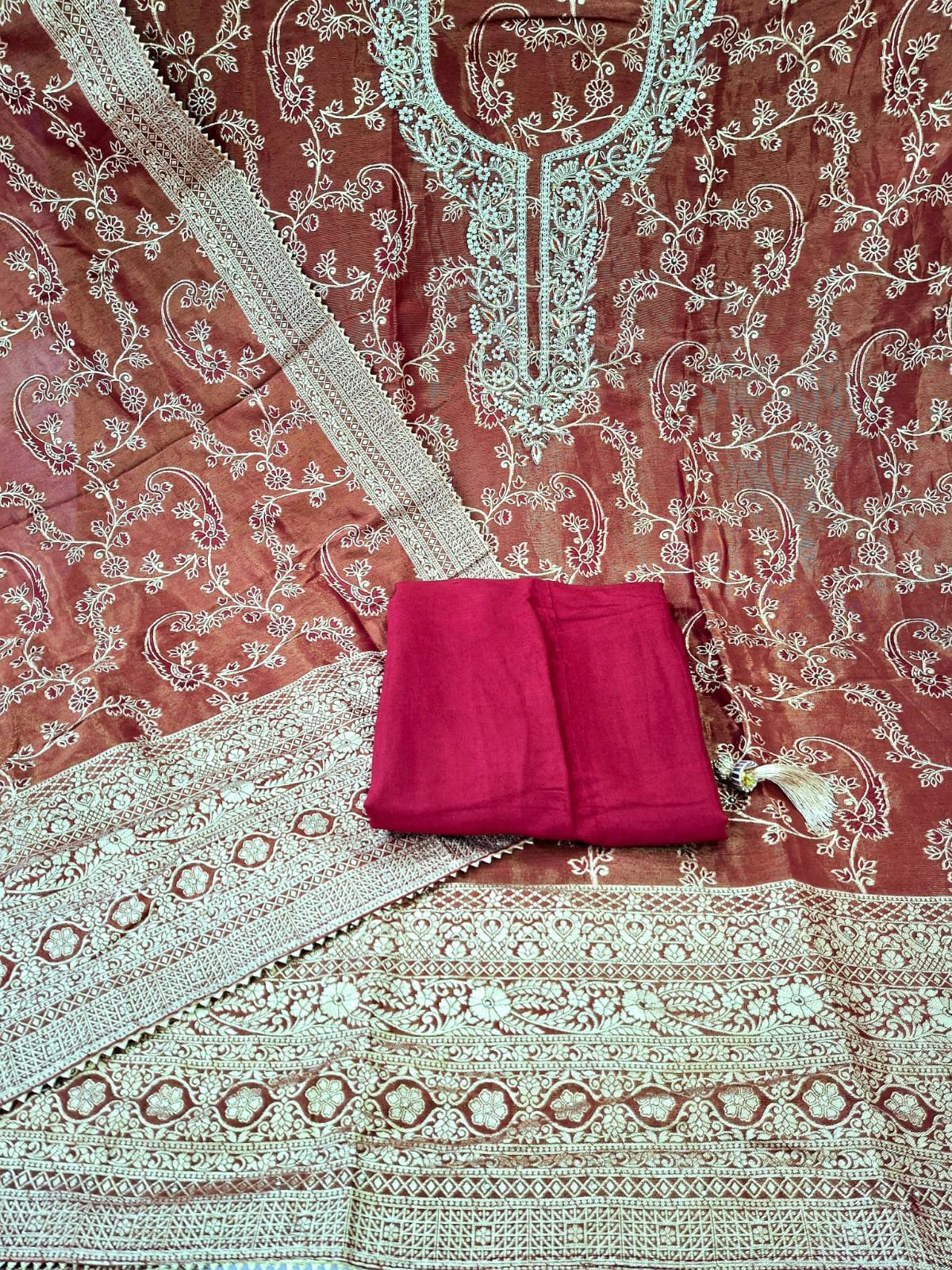 Burberry silk full suit designer weaving + hand embroidery on neck with designer burberry silk dupatta and plane bottom.
