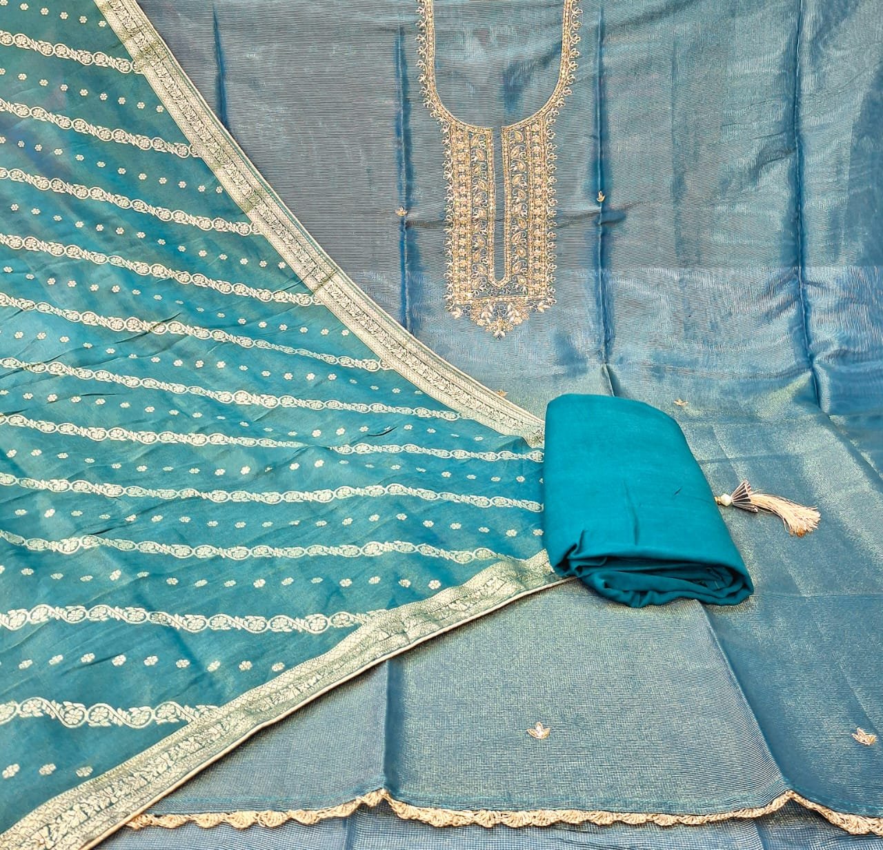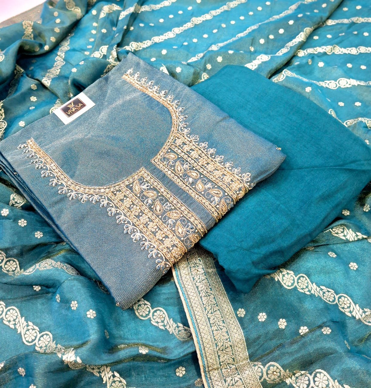 Pure burberry fabric heavy neck hand embroidery work designer suit with plane bottom and jacquard silk designer dupatta.