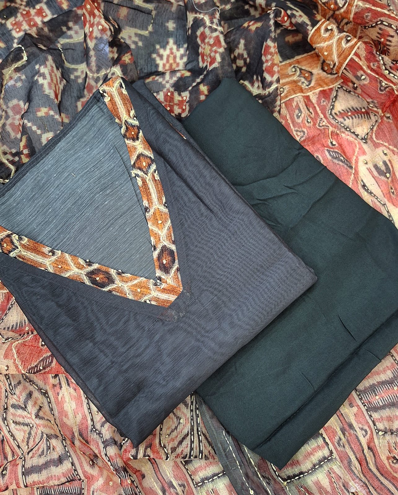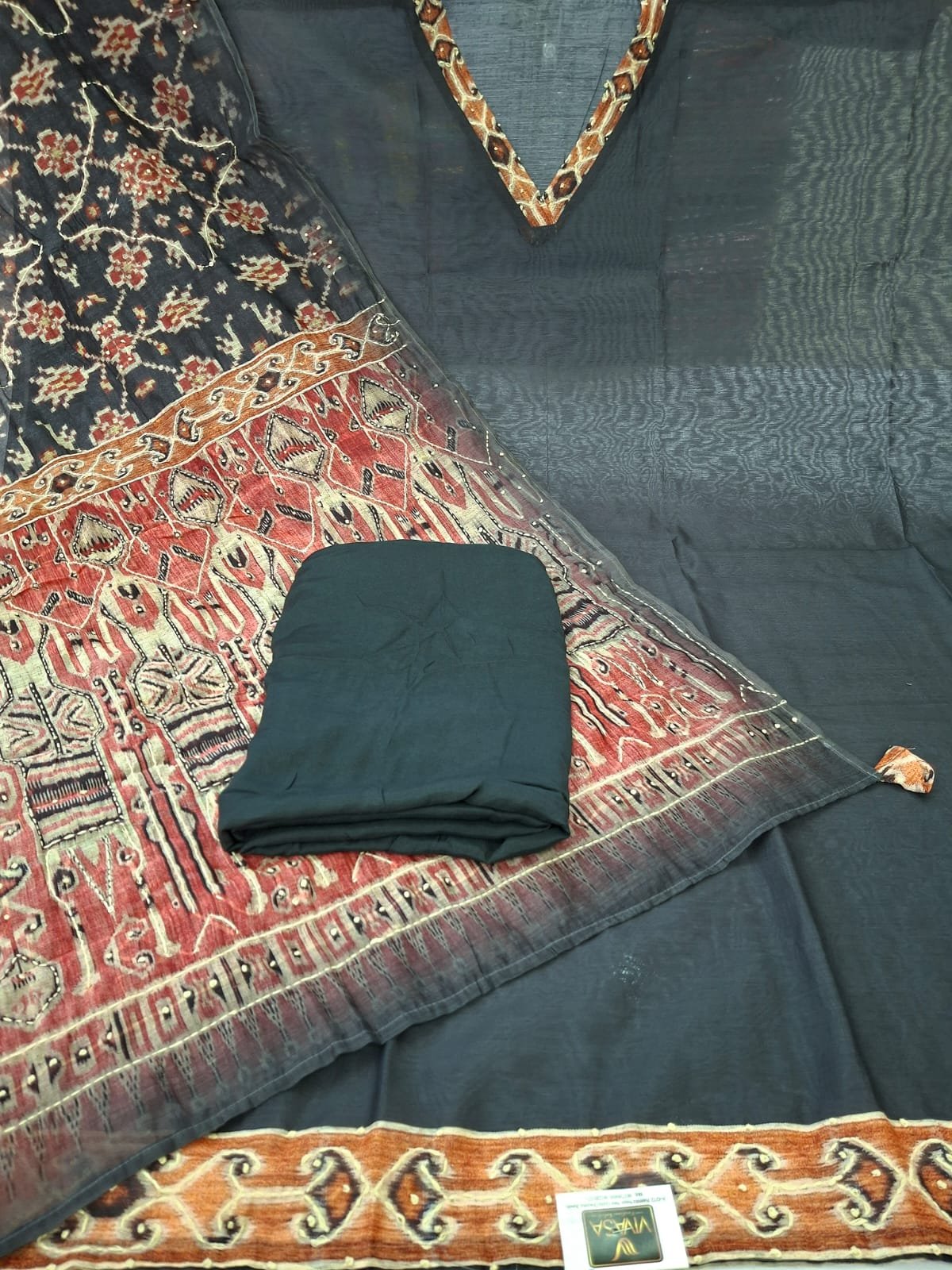 Chanderi stylish kantha work self print suit with fancy kantha work chanderi dupatta and plane bottom.