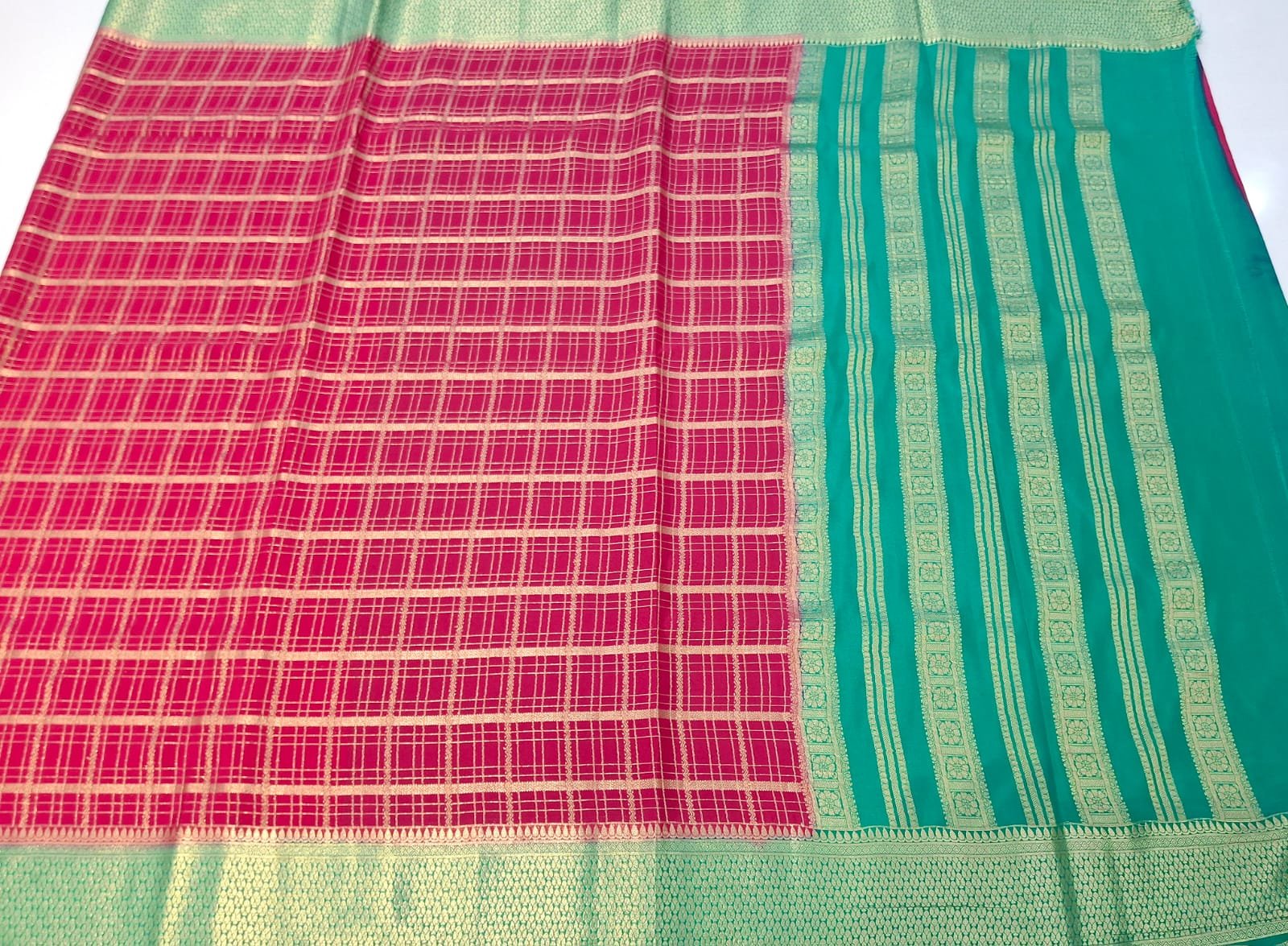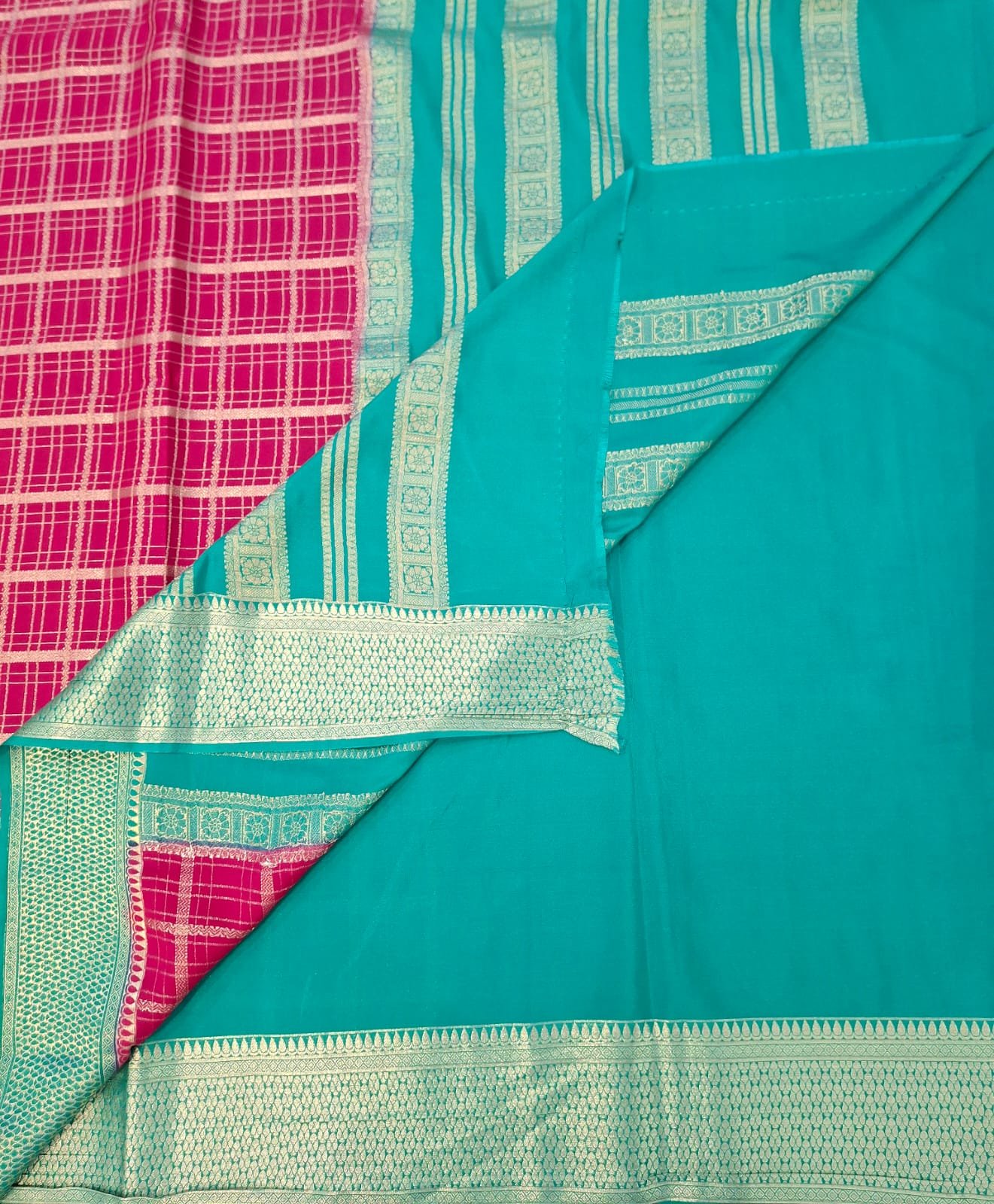 Pure Chinnon silk designer saree with contrast pallu and contrast blouse.