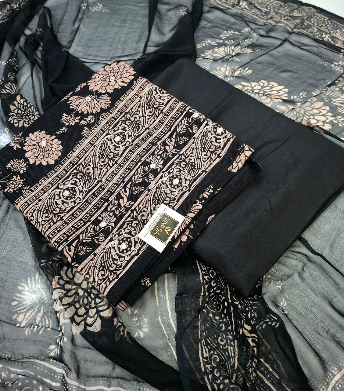 Cotarize Woollen digital printed with thread embroidery work suit with woollen bottom and printed chiffon dupatta.