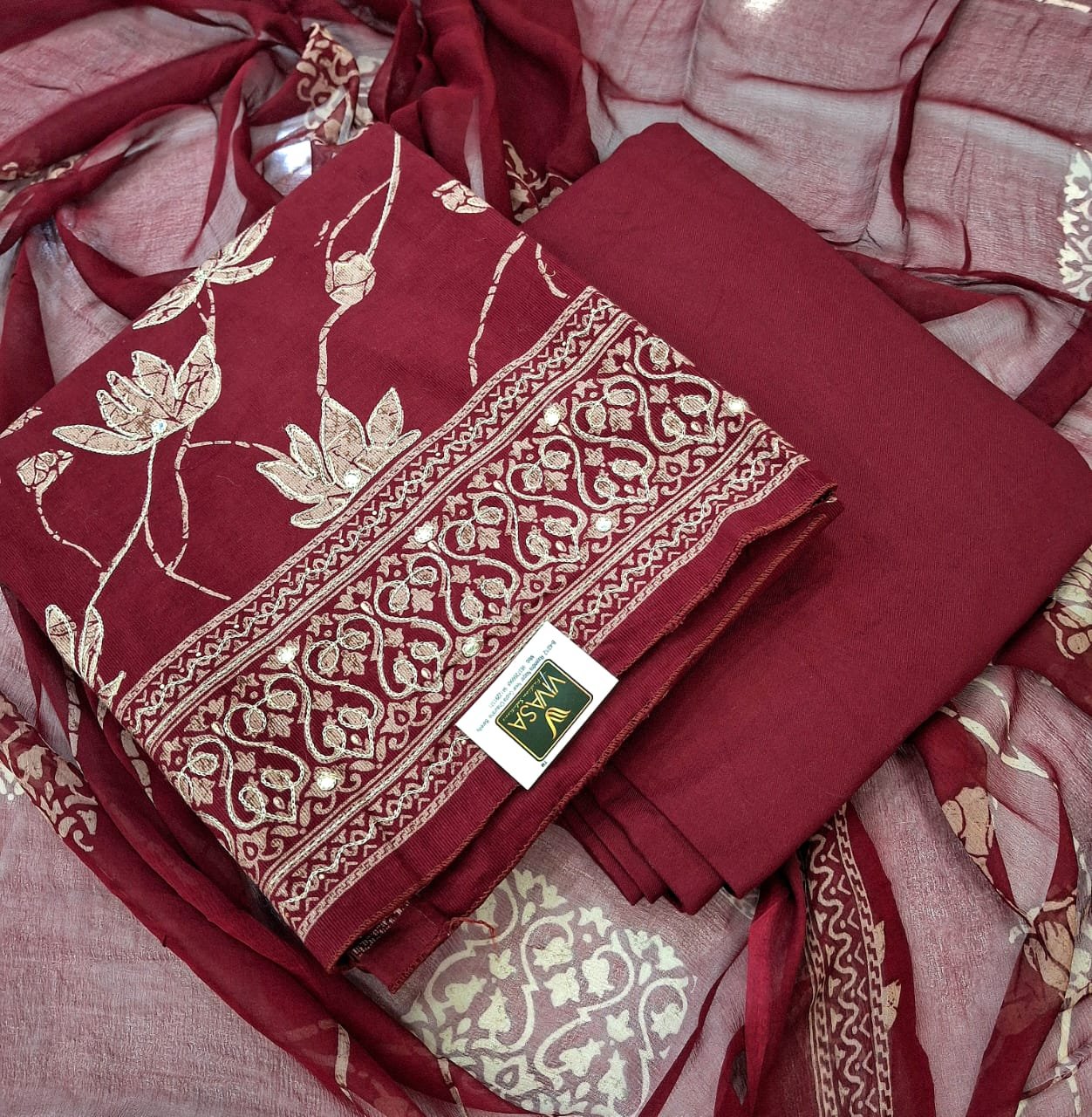 Cotarize woollen printed and thread work suit with pure chiffon dupatta and woollen bottom.
