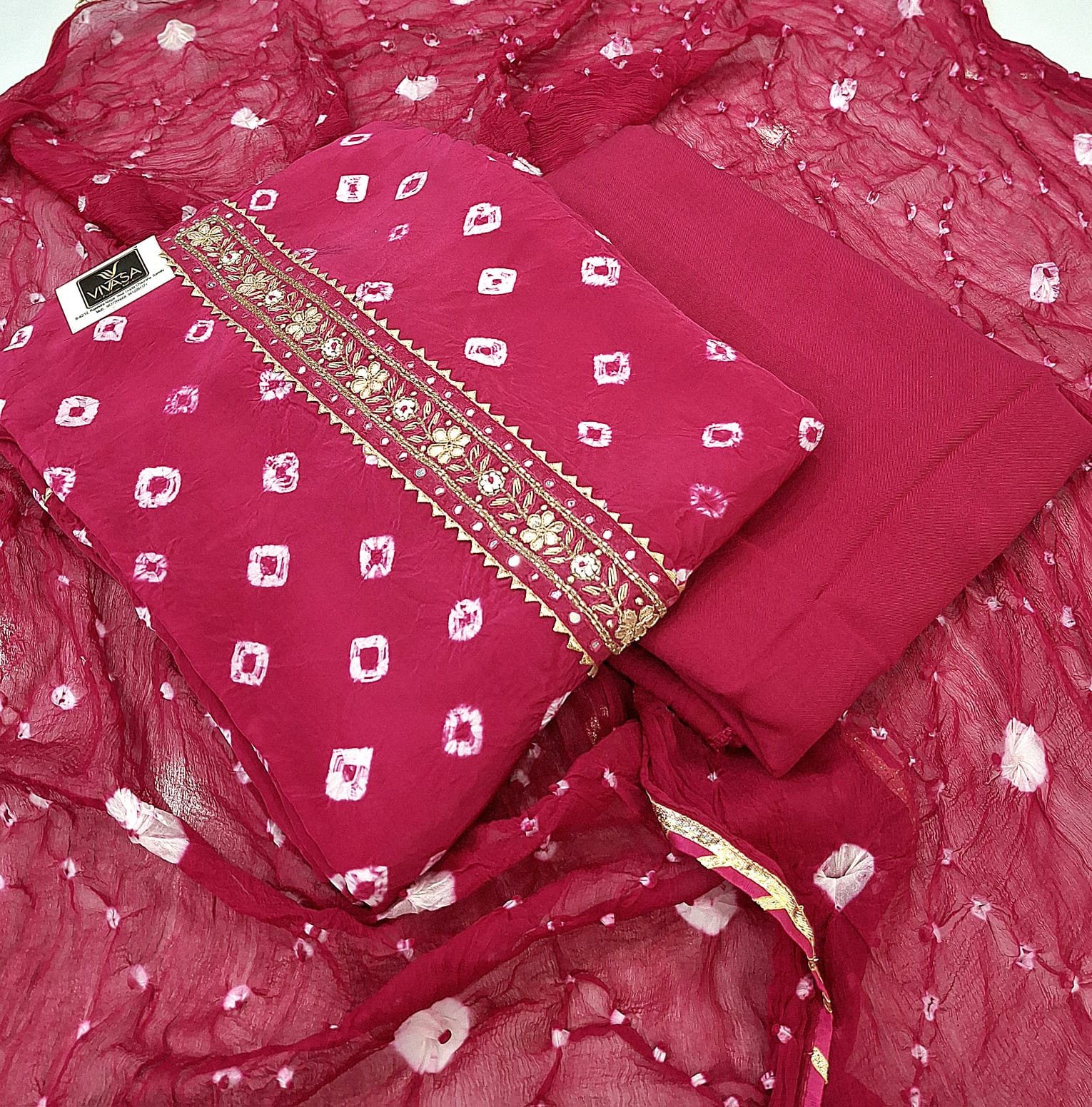 Crape silk fabric bandhej print suit with bandhej dupatta and plane bottom.