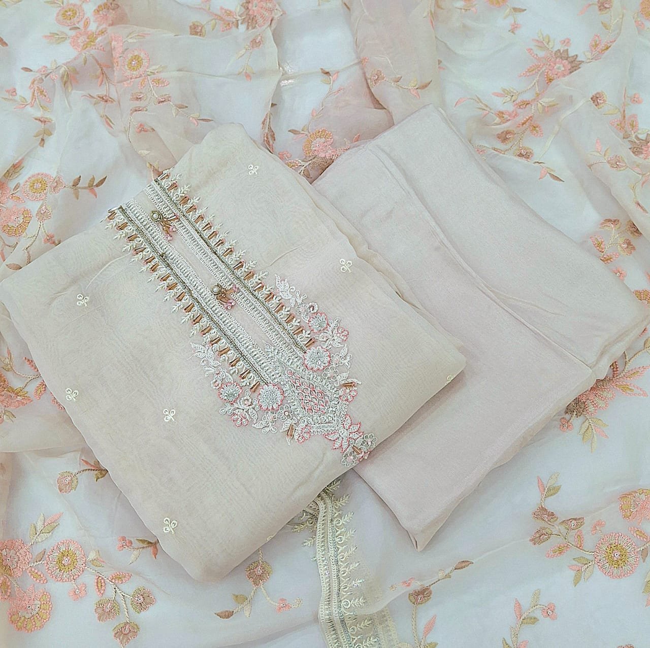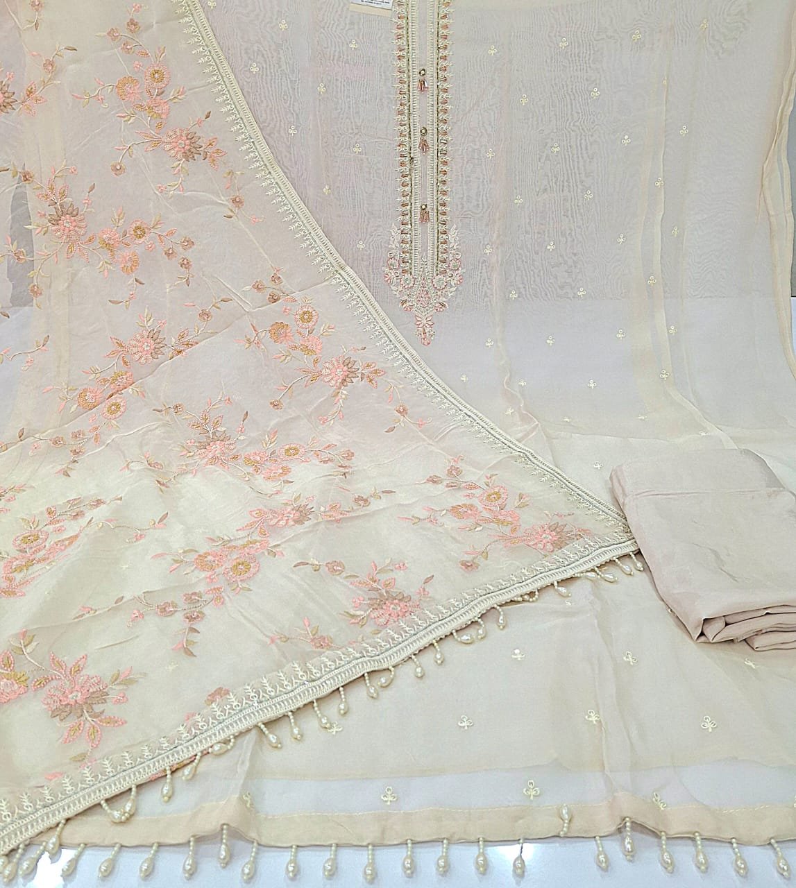 Designer pure organza silk stone work suit with plane bottom and pure kashmiri embroidery designer dupatta.