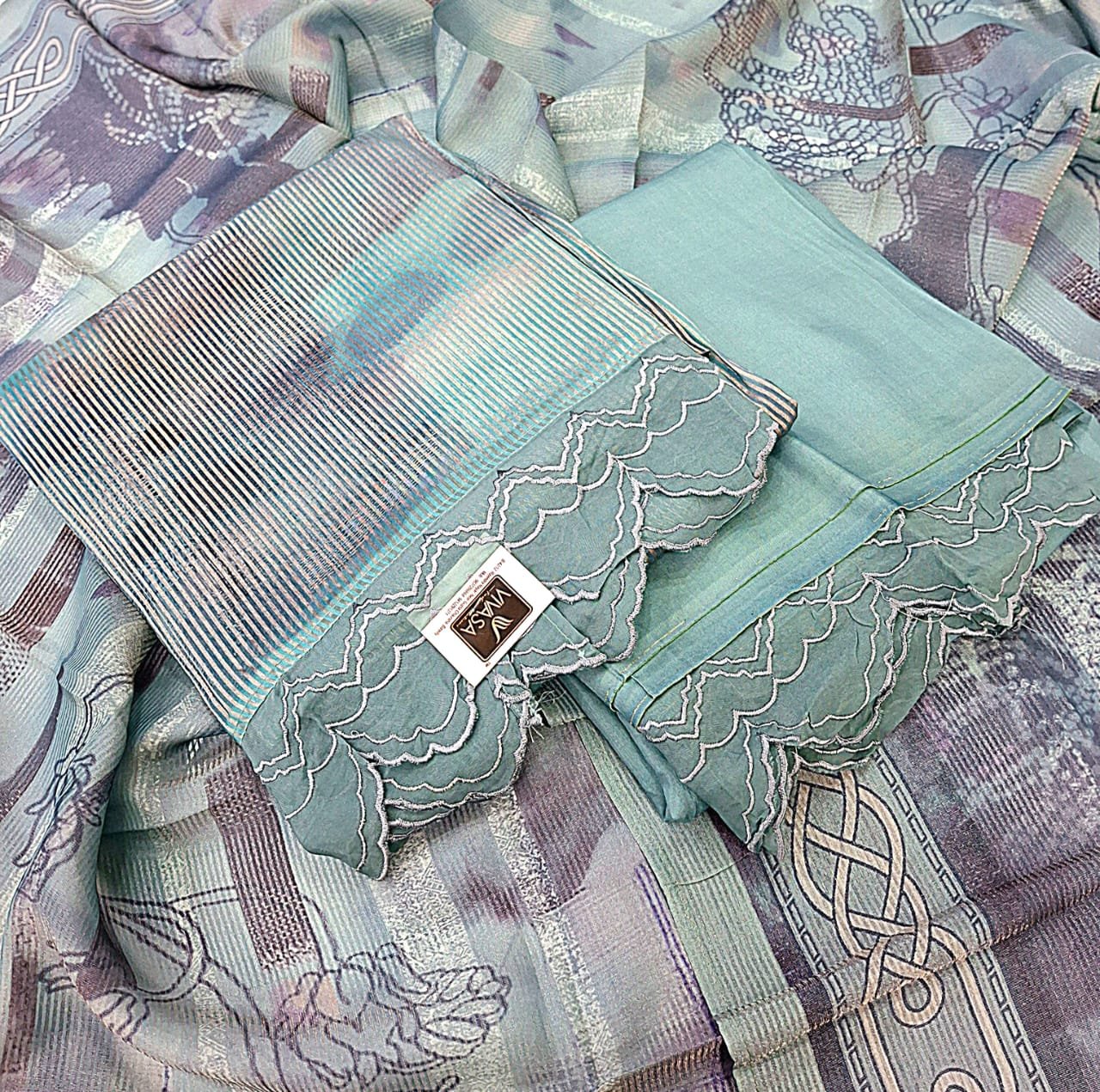 Pure tissue designer concept suit with patch work and lace work with designer tissue dupatta and designer lace work botom.