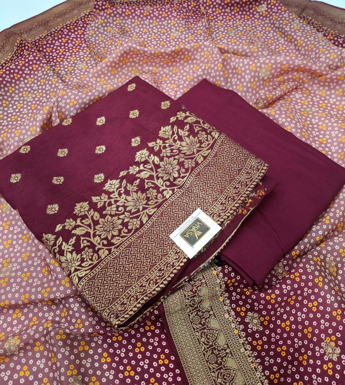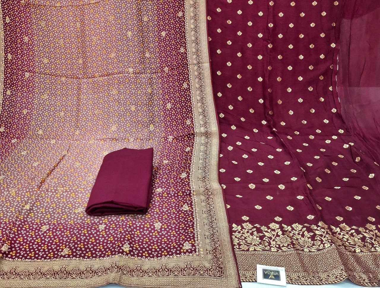 Dola silk fabric zardozi weaving suit with plane bottom and dola silk dupatta.
