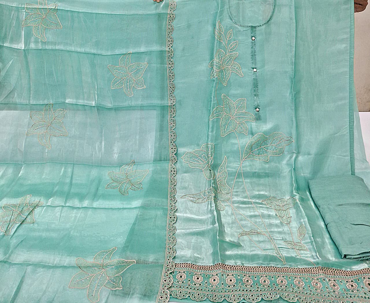 Fendy silk designer thread embroidery suit with designer cut work dupatta and plane bottom.