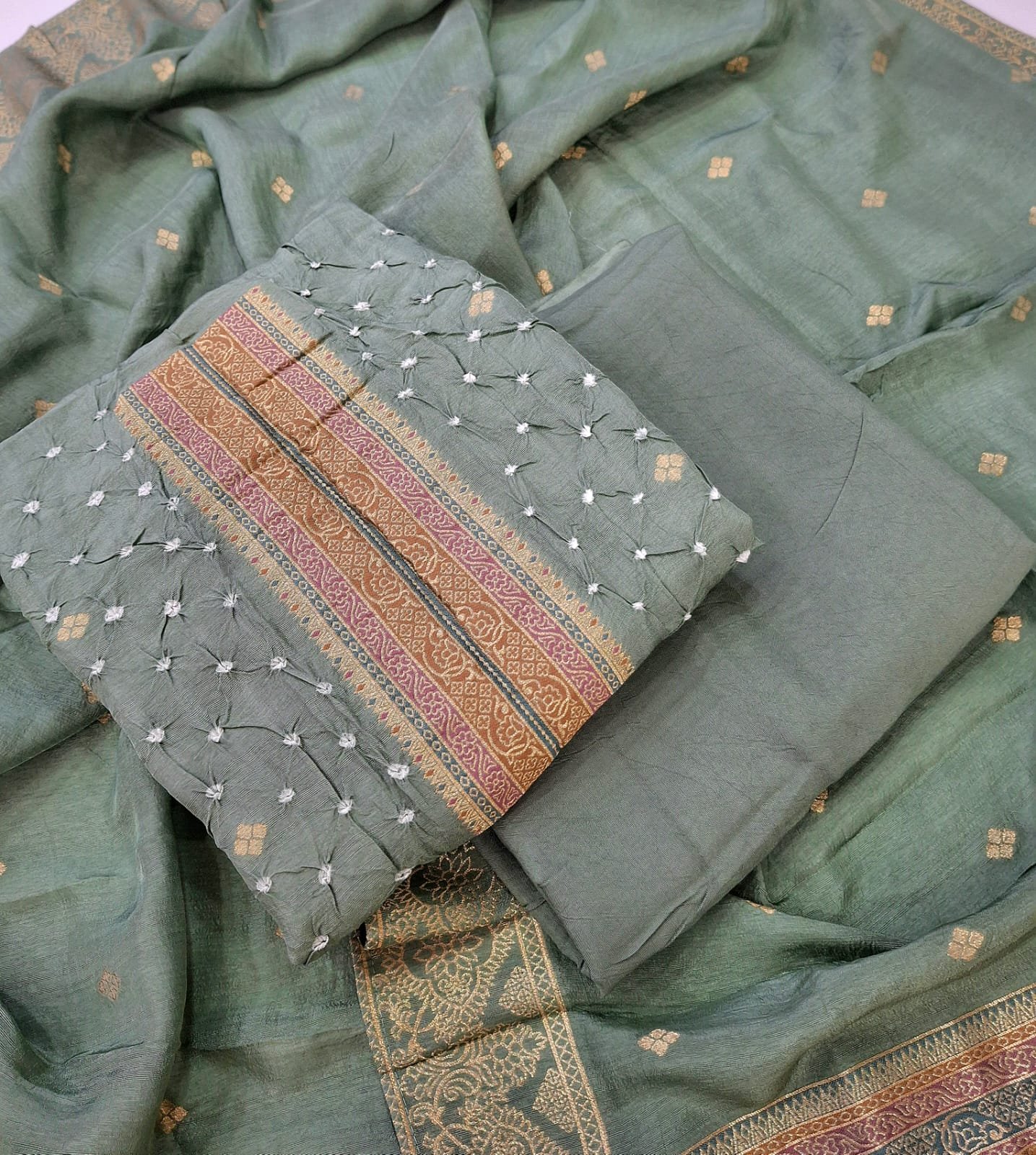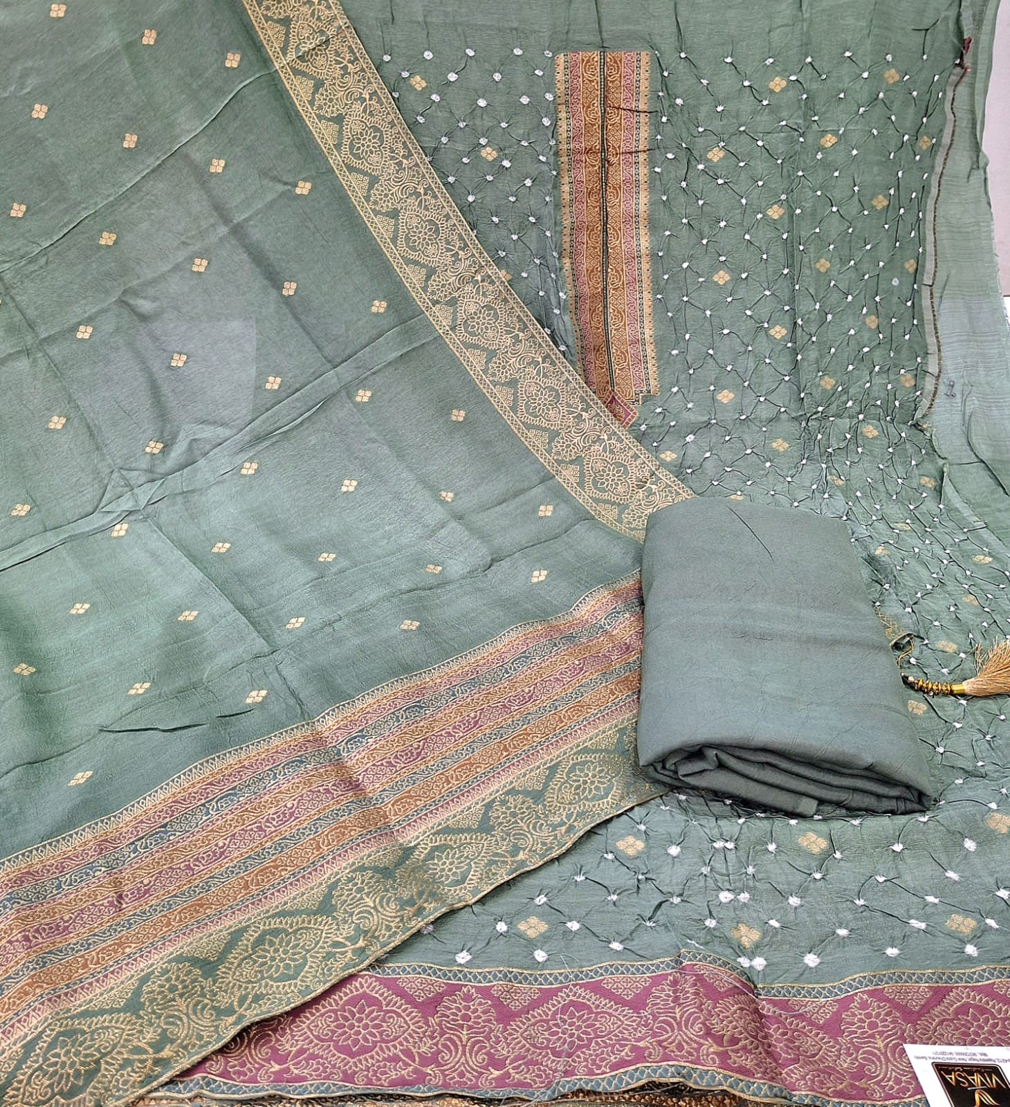 Pure Gajji silk bandhej designer suit with gajji silk bandhej dupatta and plane bottom.