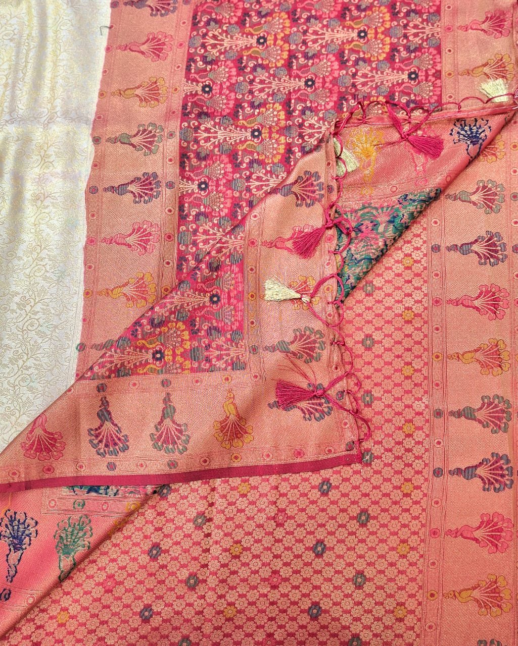 Semi Kanjiveram silk fabric designer weaving work saree with contrast pallu and contrast blouse.