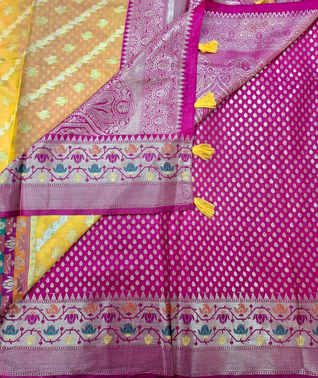 Katan silk fabric designer weaving and print work saree with contrast pallu and contrast blouse.