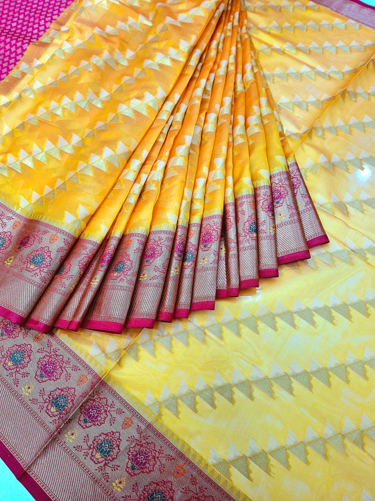 Katan Silk fabric designer weaving and print work saree with contrast pallu and contrast blouse.