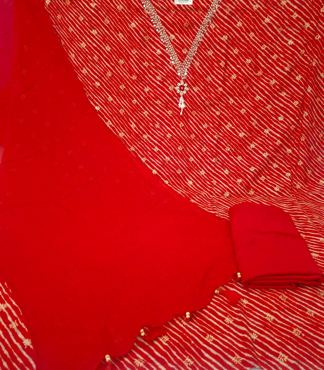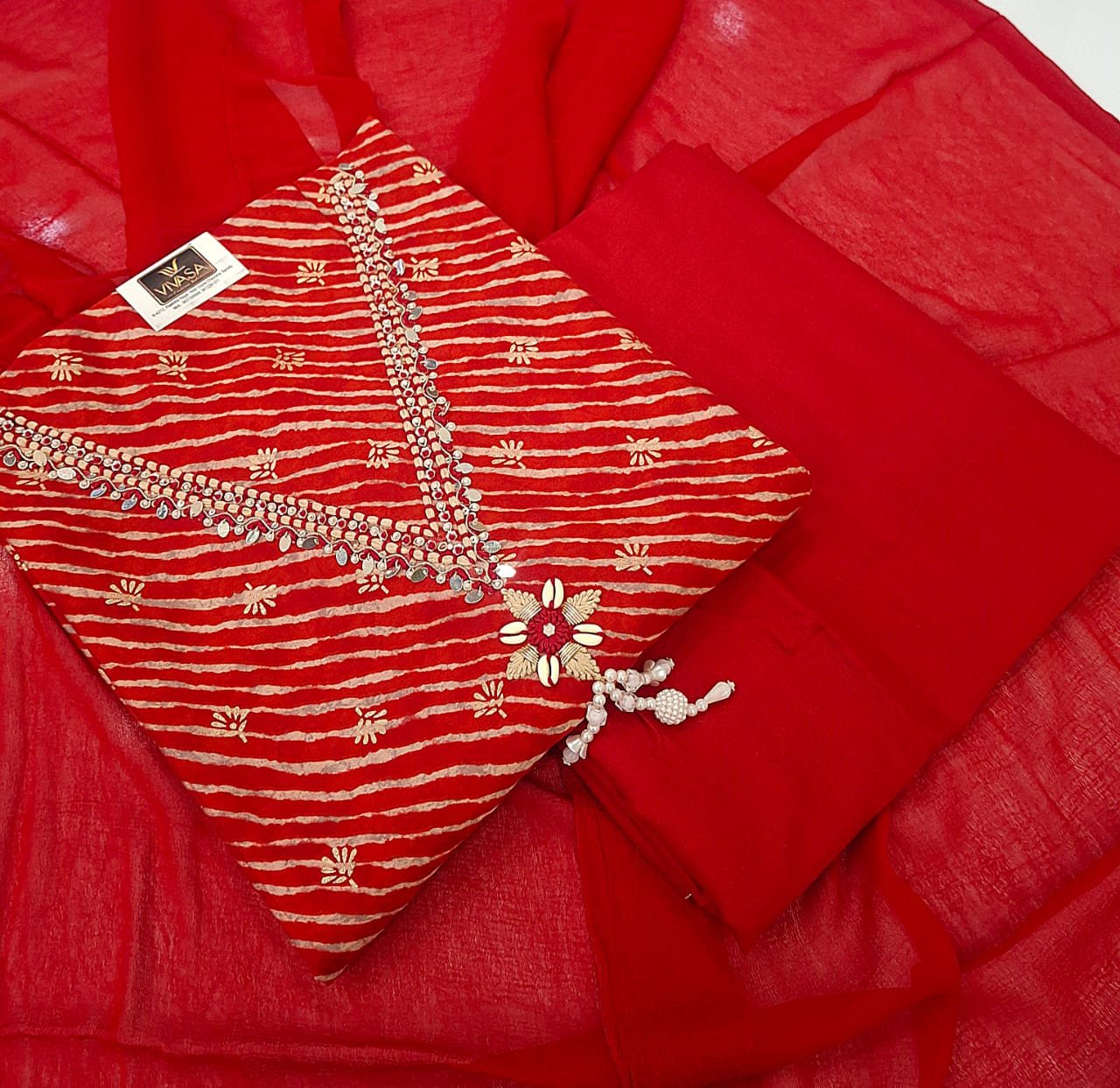 Modal silk fabric V style neck embroidery work lehriya print suit with chiffon dupatta and plane bottom.