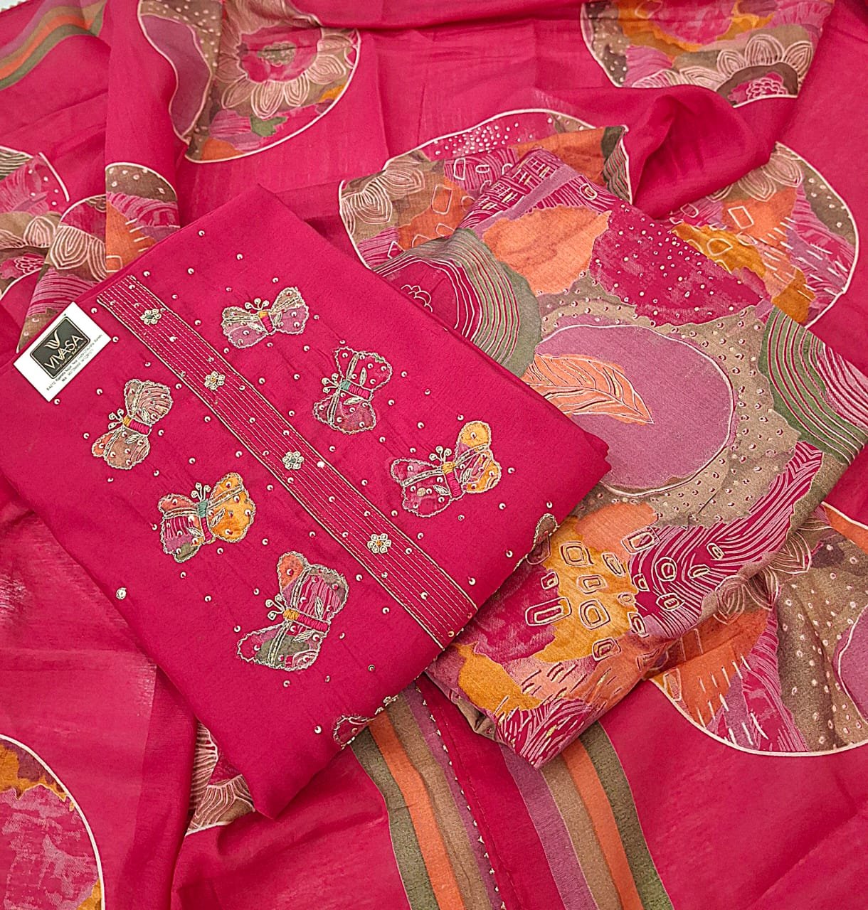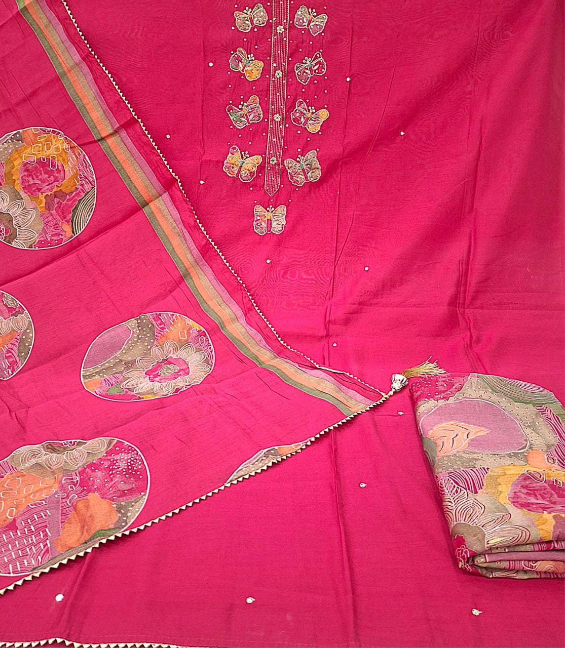 Modal silk flowing fabric neck patch work embroidery design with printed modal silk bottom and printed modal silk dupatta.