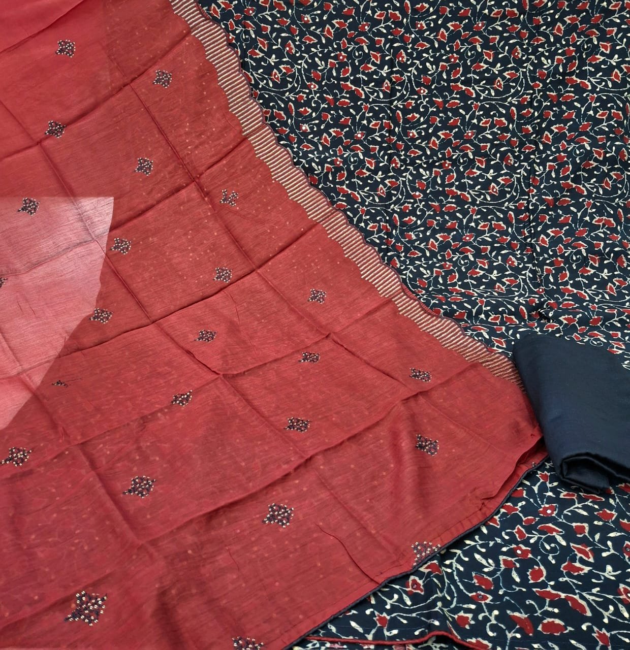 Muslin printed suit with plane bottom and contrast cut work dupatta.