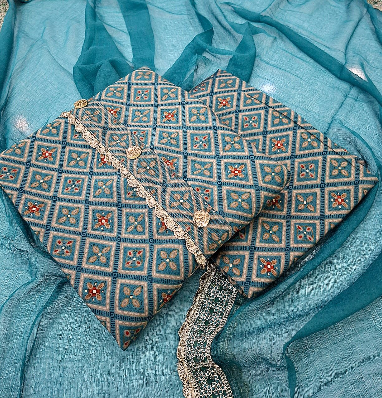Muslin printed all over design suit with chiffon embroidery dupatta.