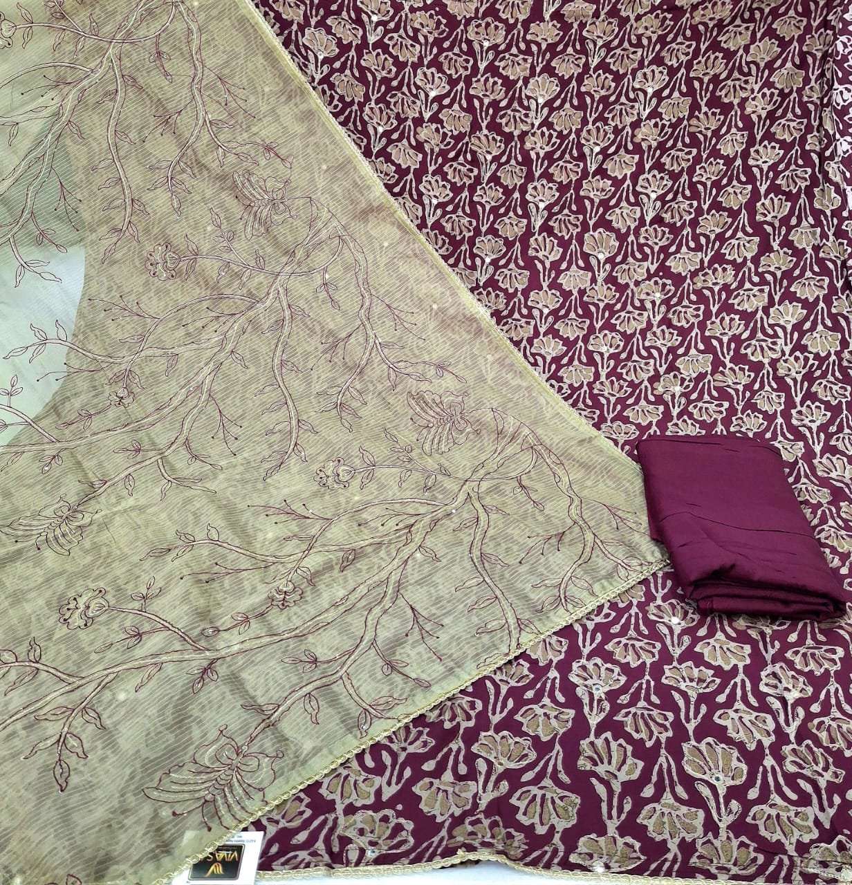 Muslin printed thread embroidery suit with plane bottom and contrast embroidery work dupatta.