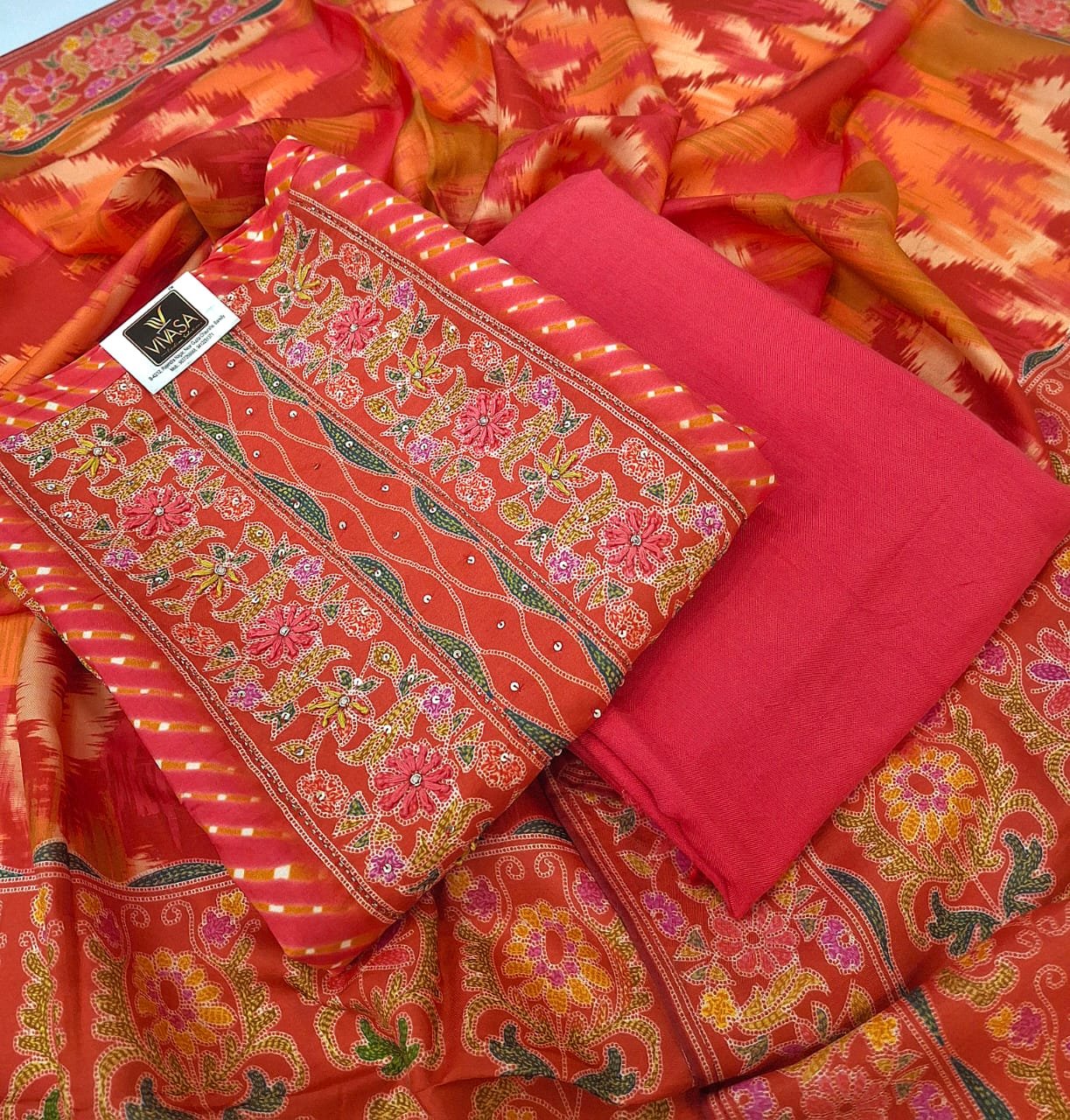 Muslin printed designer suit with plane bottom and fancy printed muslin dupatta.