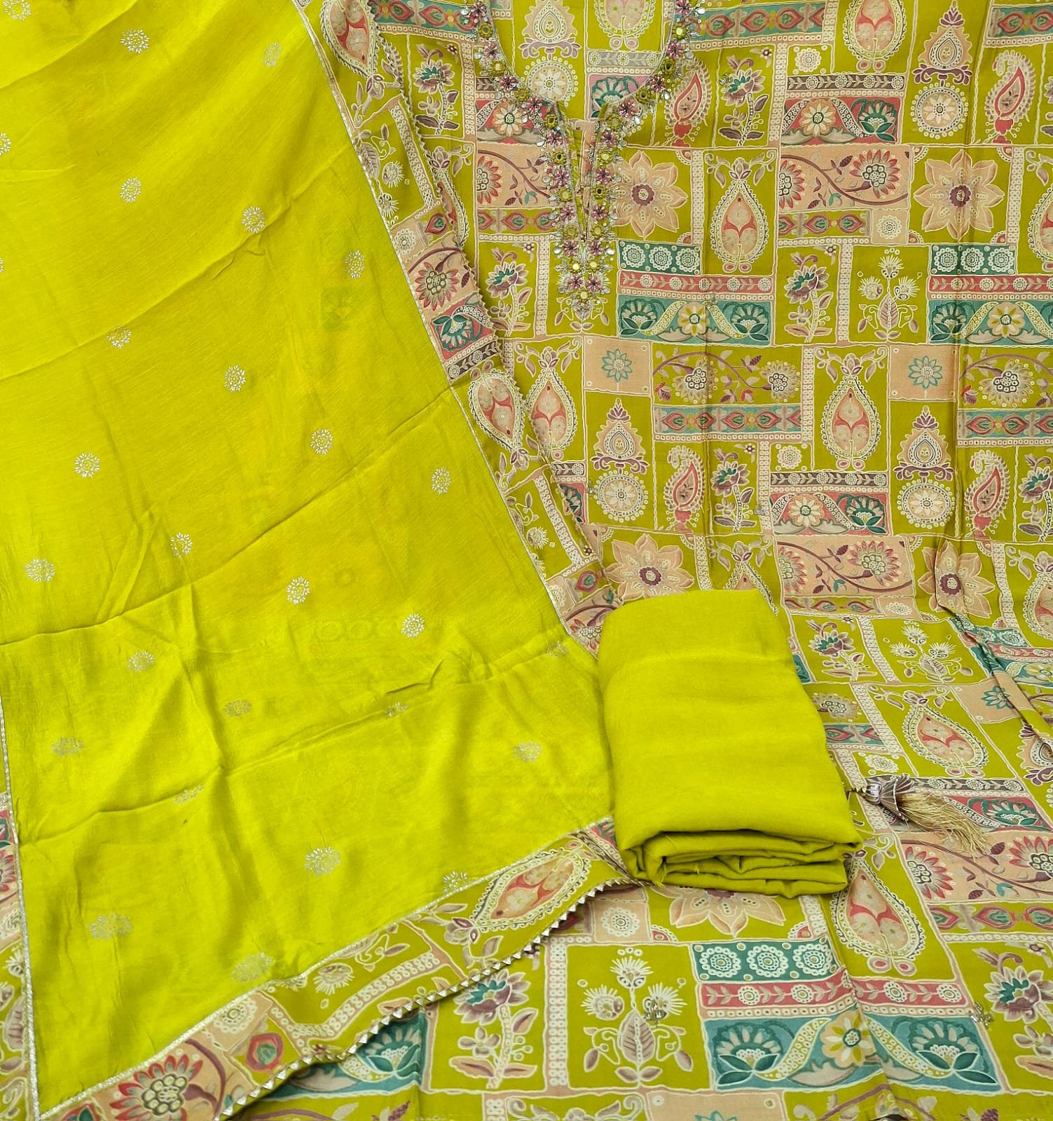 Muslin silk printed neck hand embroidery work suit with modal fancy dupatta and plane bottom.