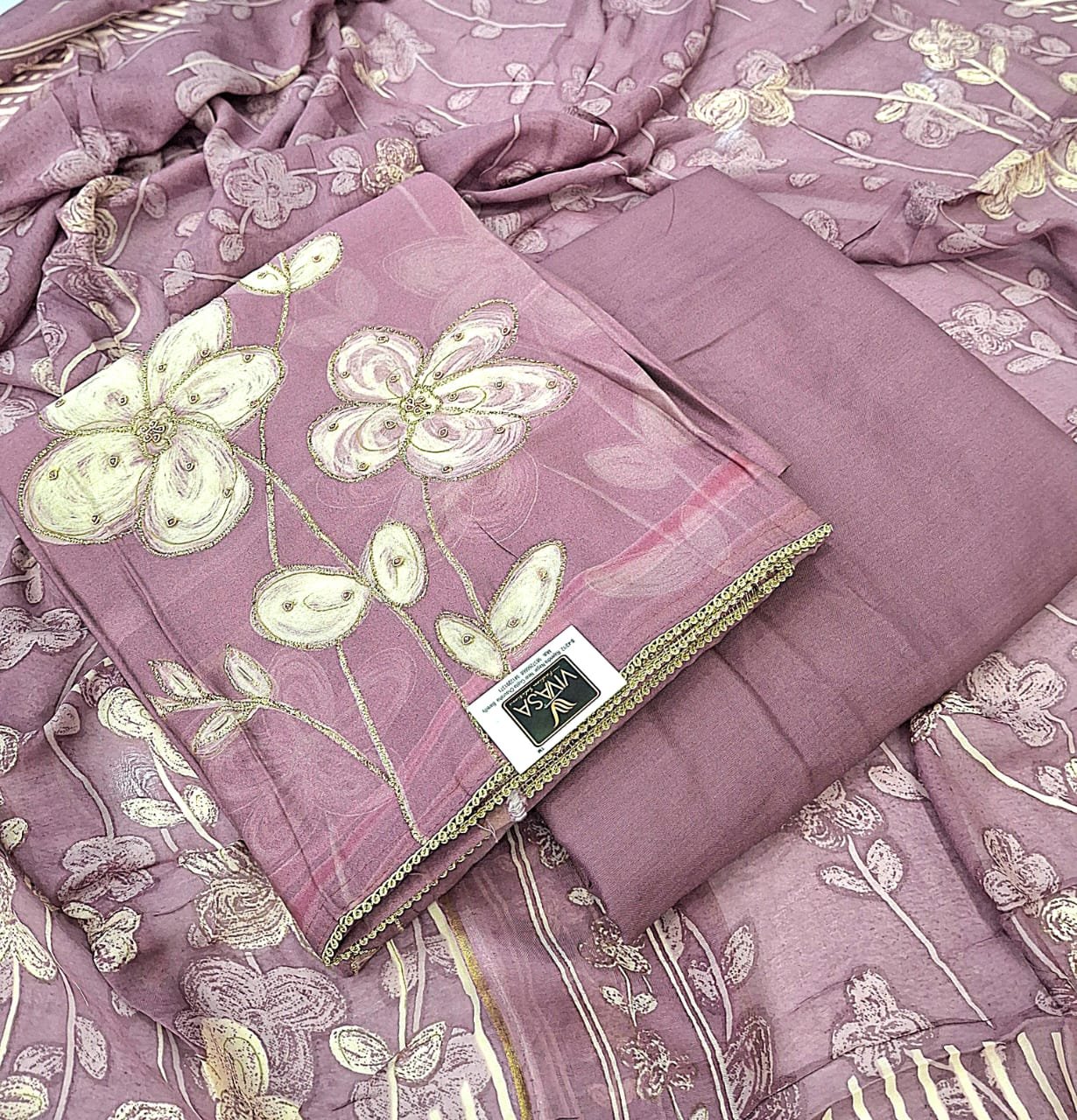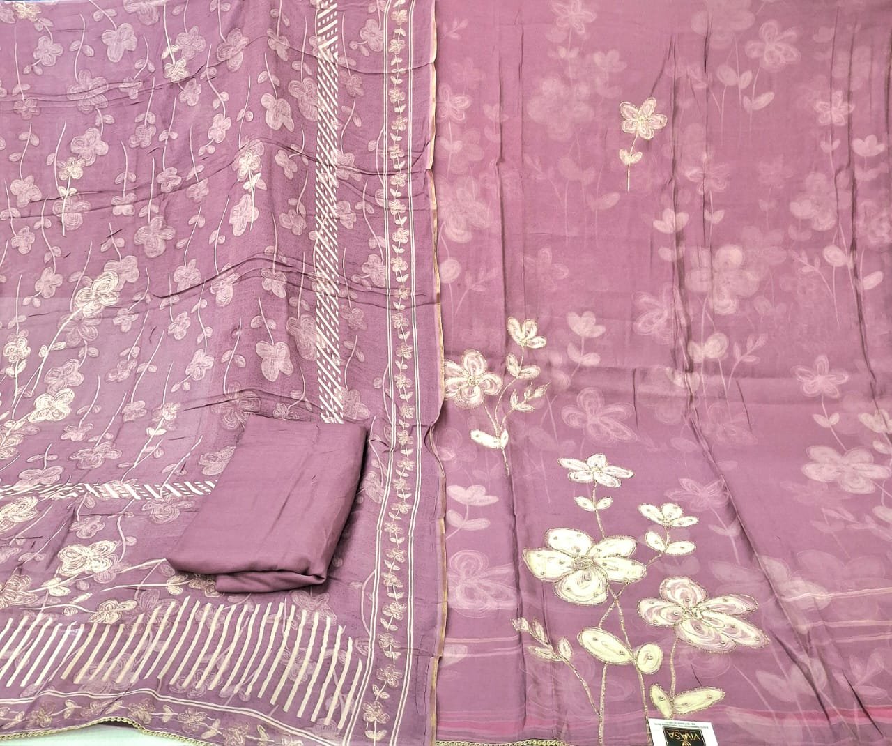 Muslin fabric 3D print with self print suit with plane bottom and fancy dupatta.