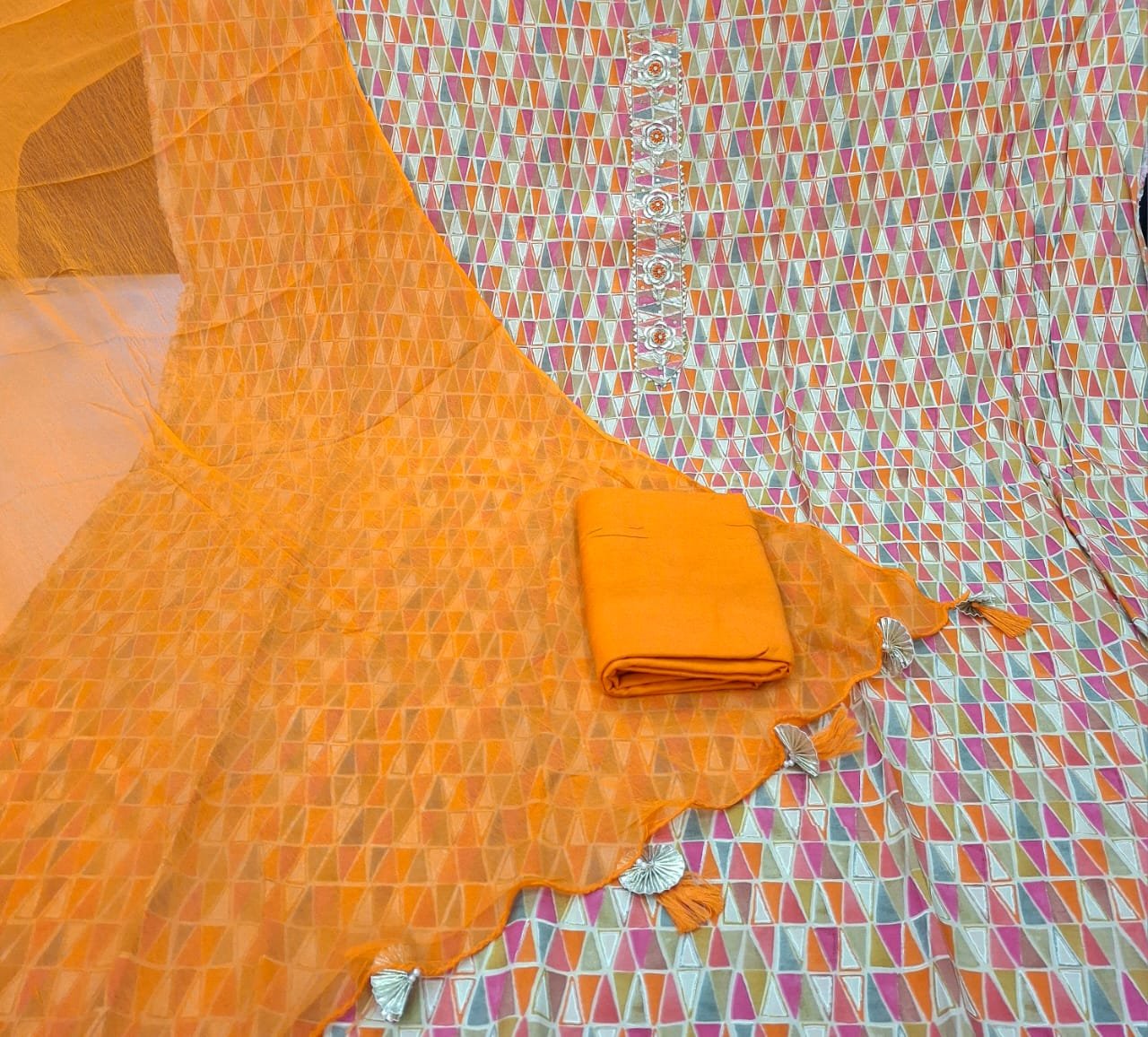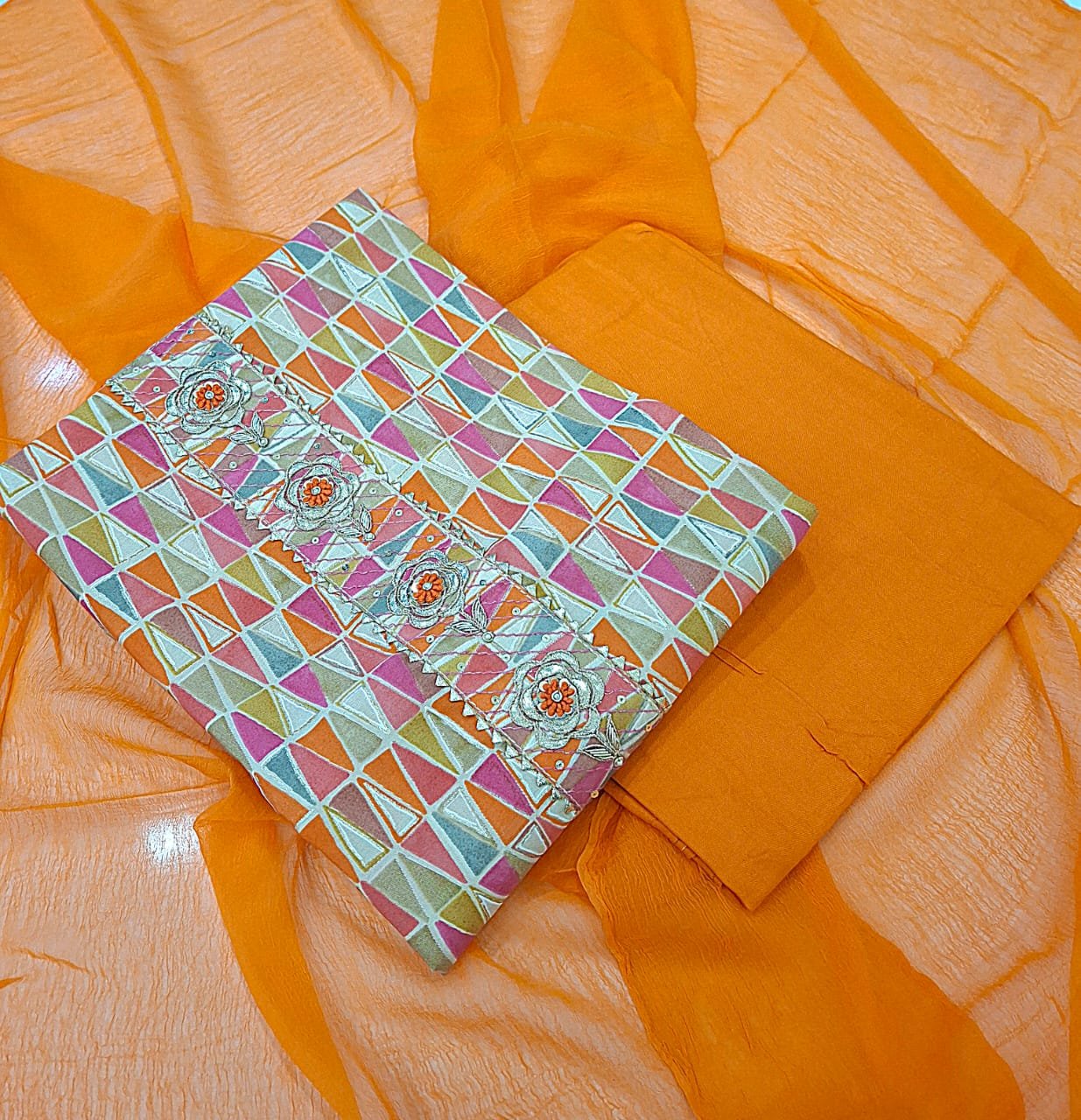 Muslin printed suit with plane bottom and chiffon dupatta.