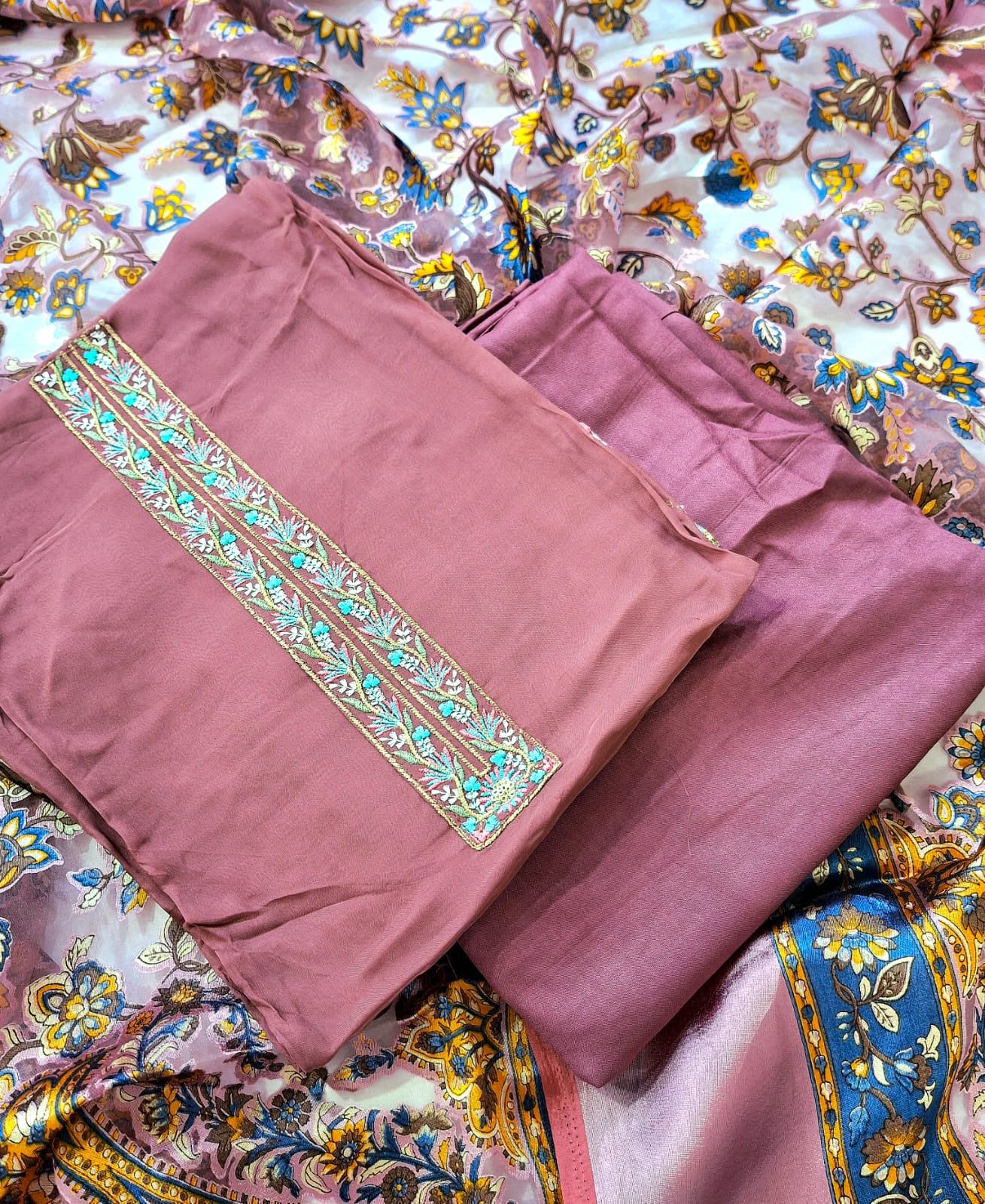 Organza thread embroidery with lace work suit with brasso designer dupatta and plane bottom.