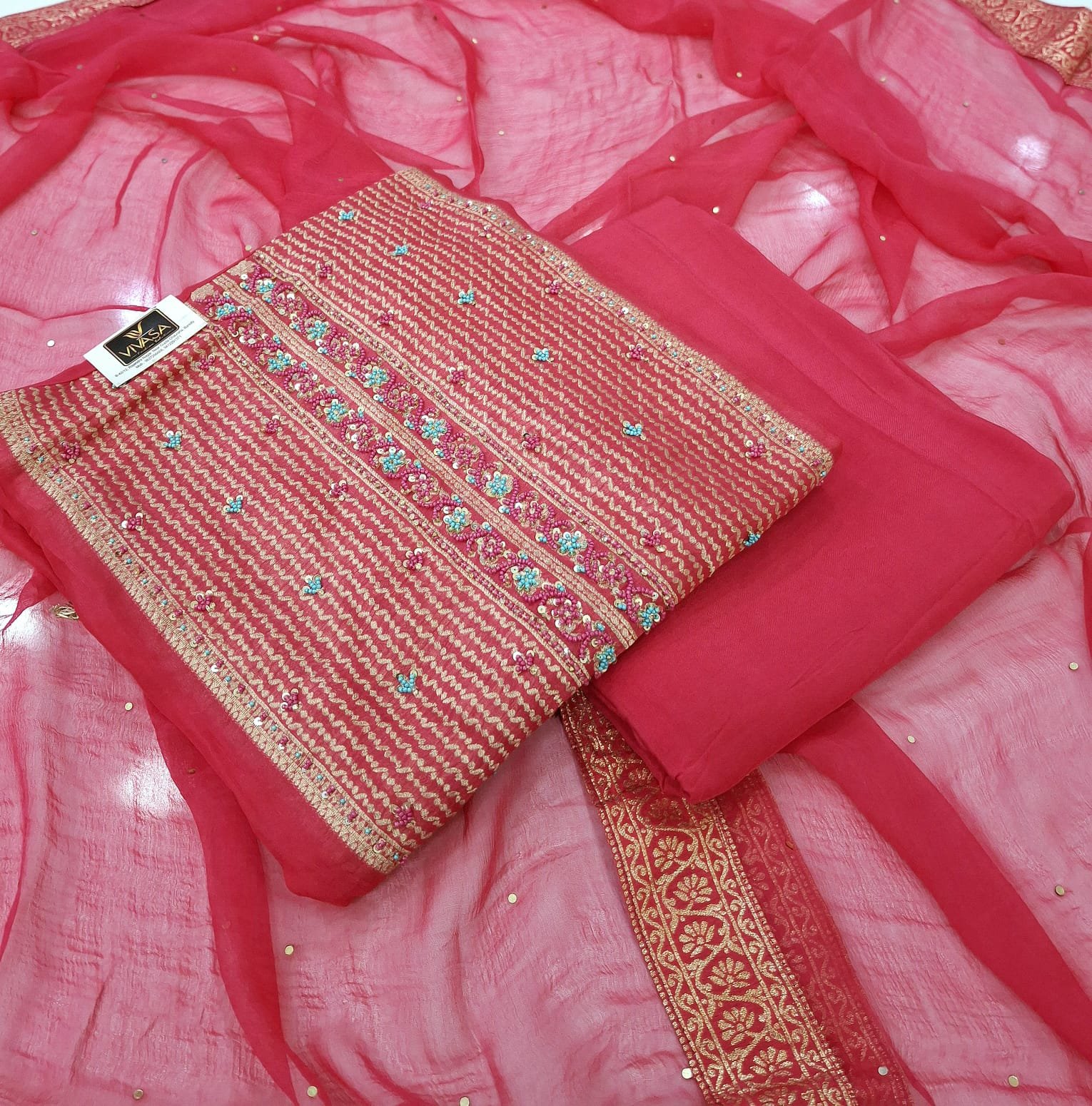 Organza silk fabric zardozi weaving design suit with plane bottom and chiffon lace work dupatta.