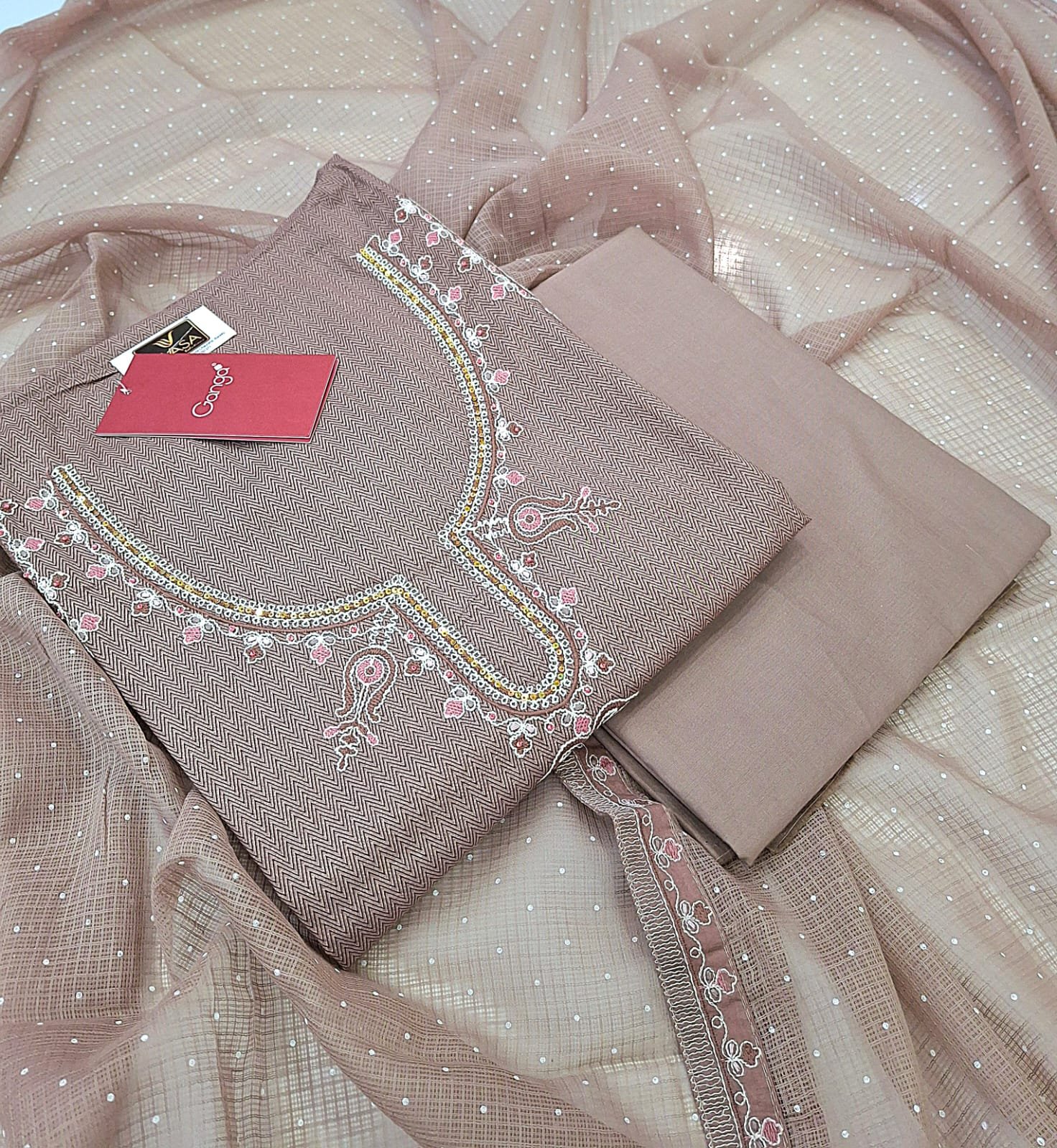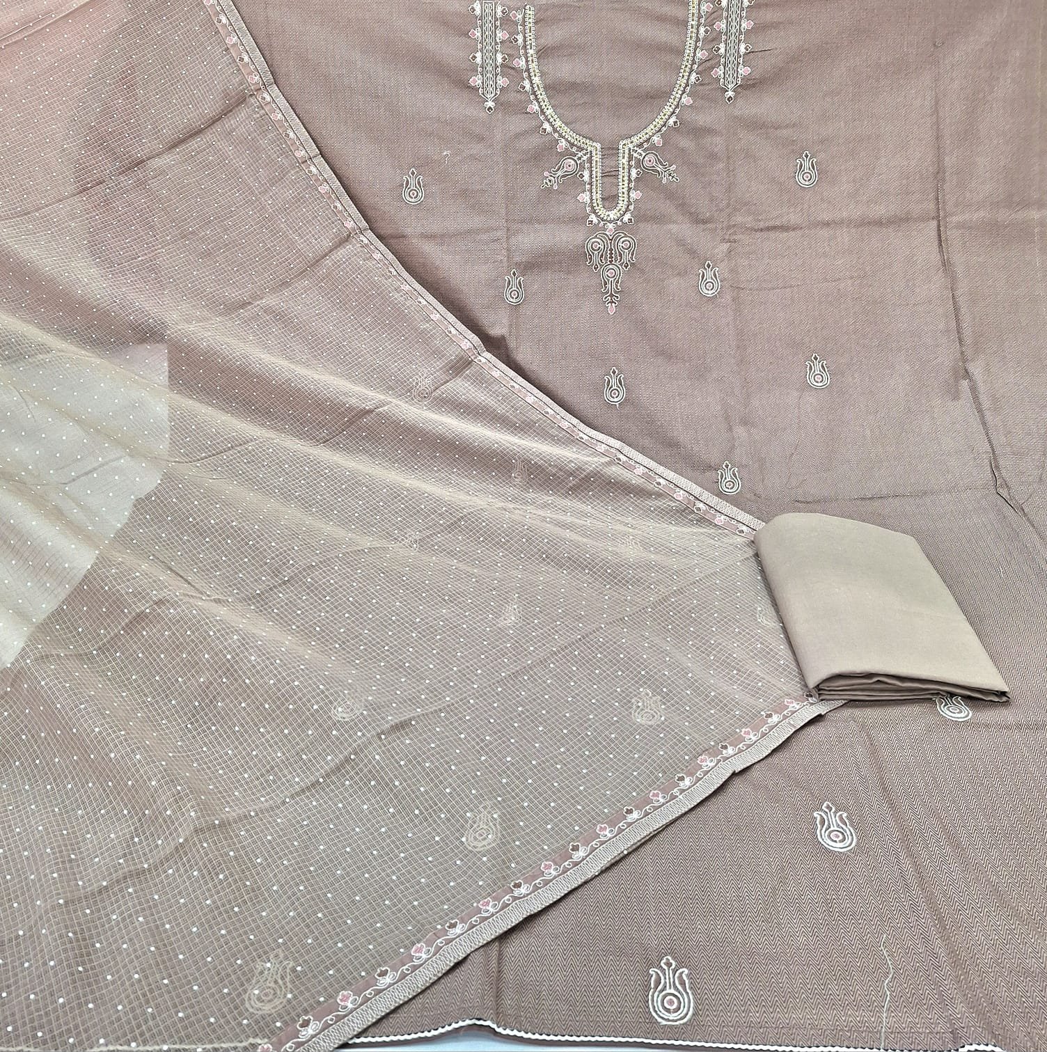 Premium pure cotton neck thread embroidery design digital printed suit with cotton bottom and fancy dupatta.