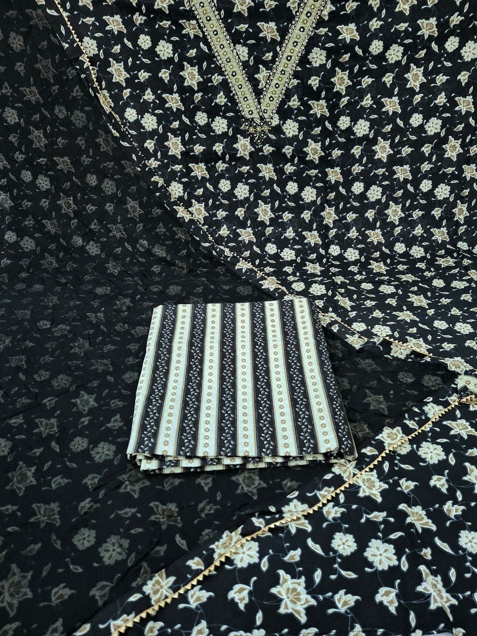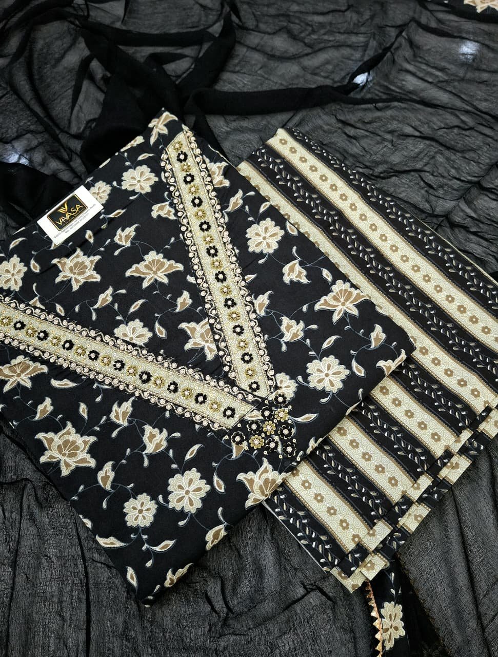 Dashing black color Pure Cotton V Style neck embroidery printed suit with chiffon dupatta and printed cotton bottom.