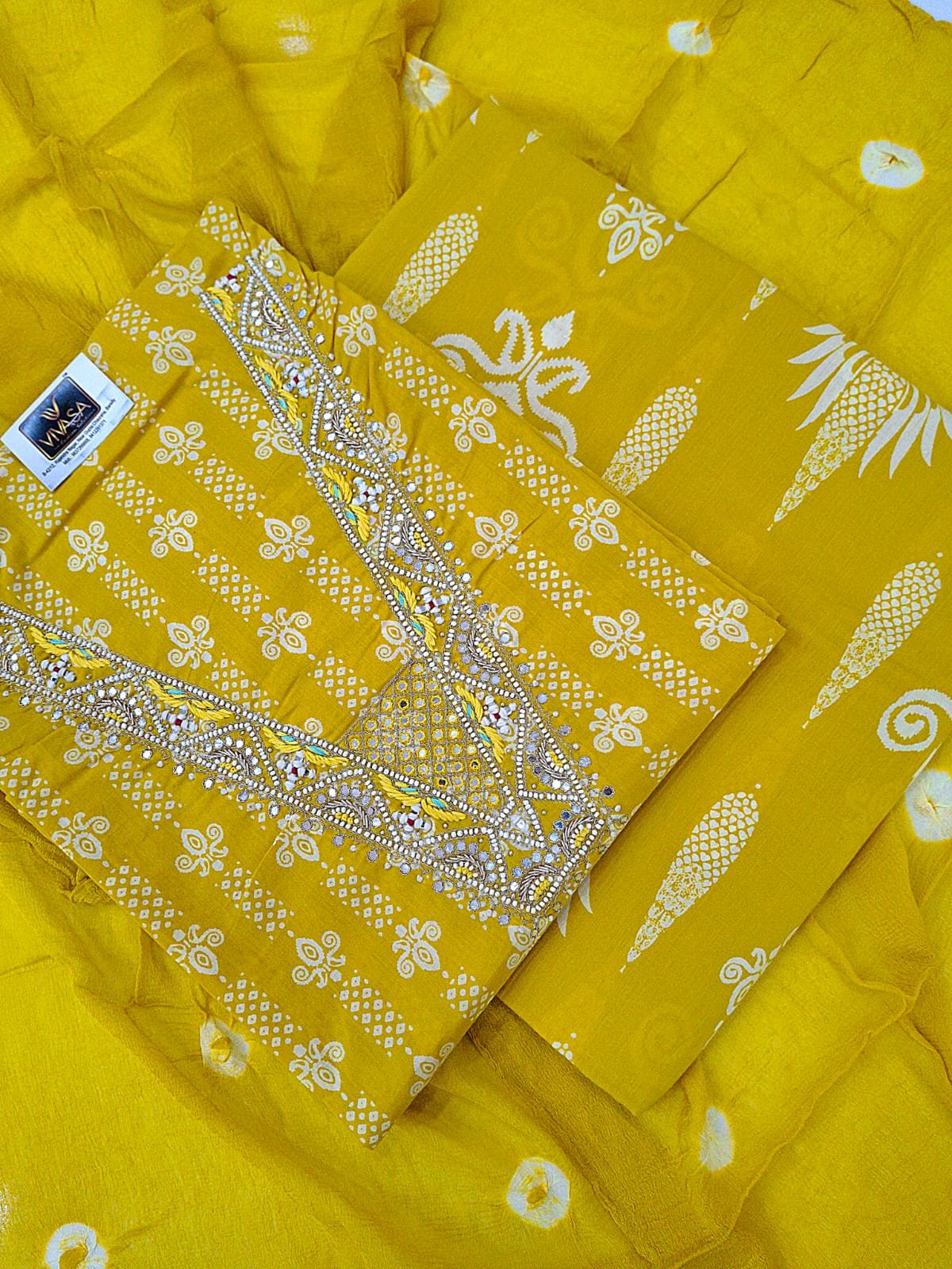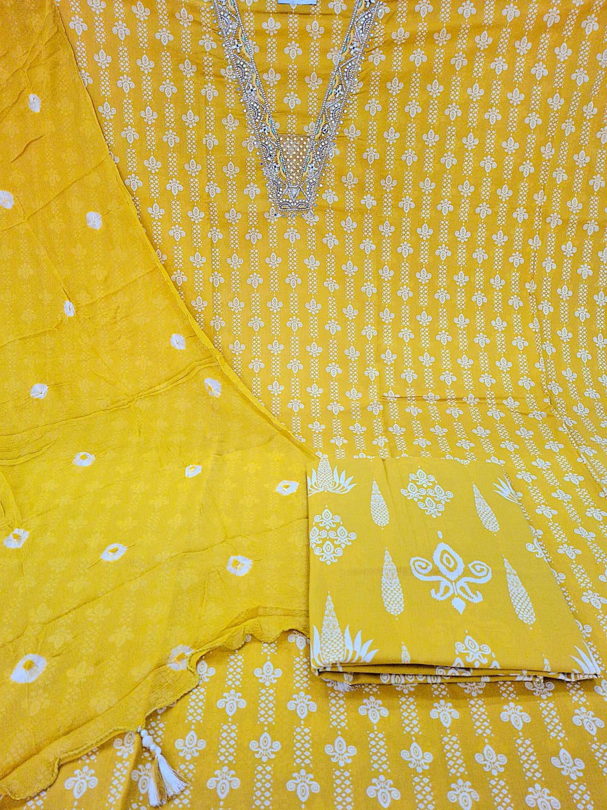 Pure Cotton V style neck thread work + mirror work suit with chiffon bandhej dupatta and printed cotton bottom.