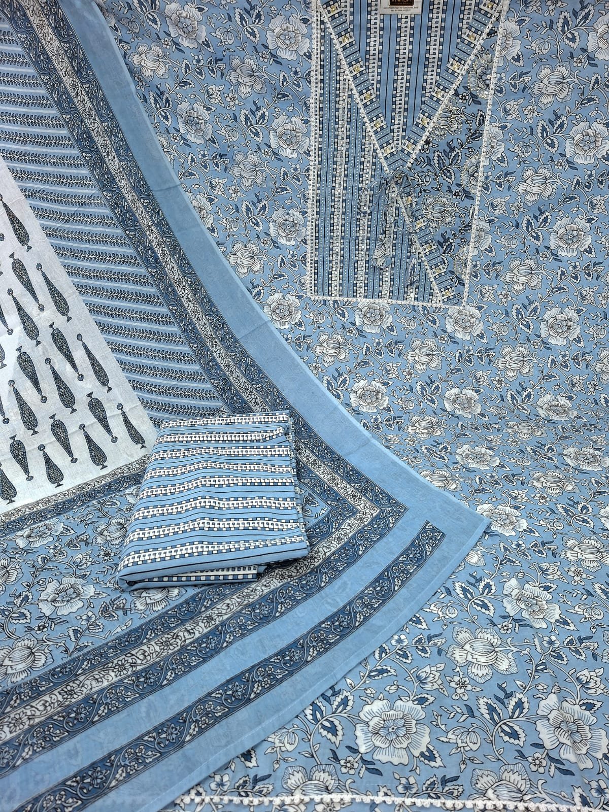 Pure cotton angrakha style neck work printed suit with jaipuri cotton dupatta and cotton printed bottom.