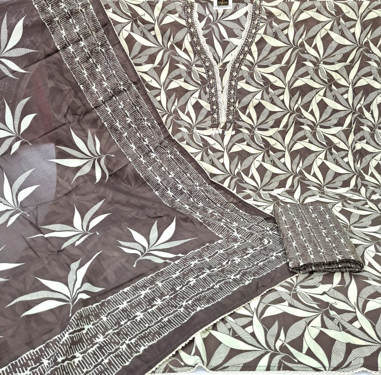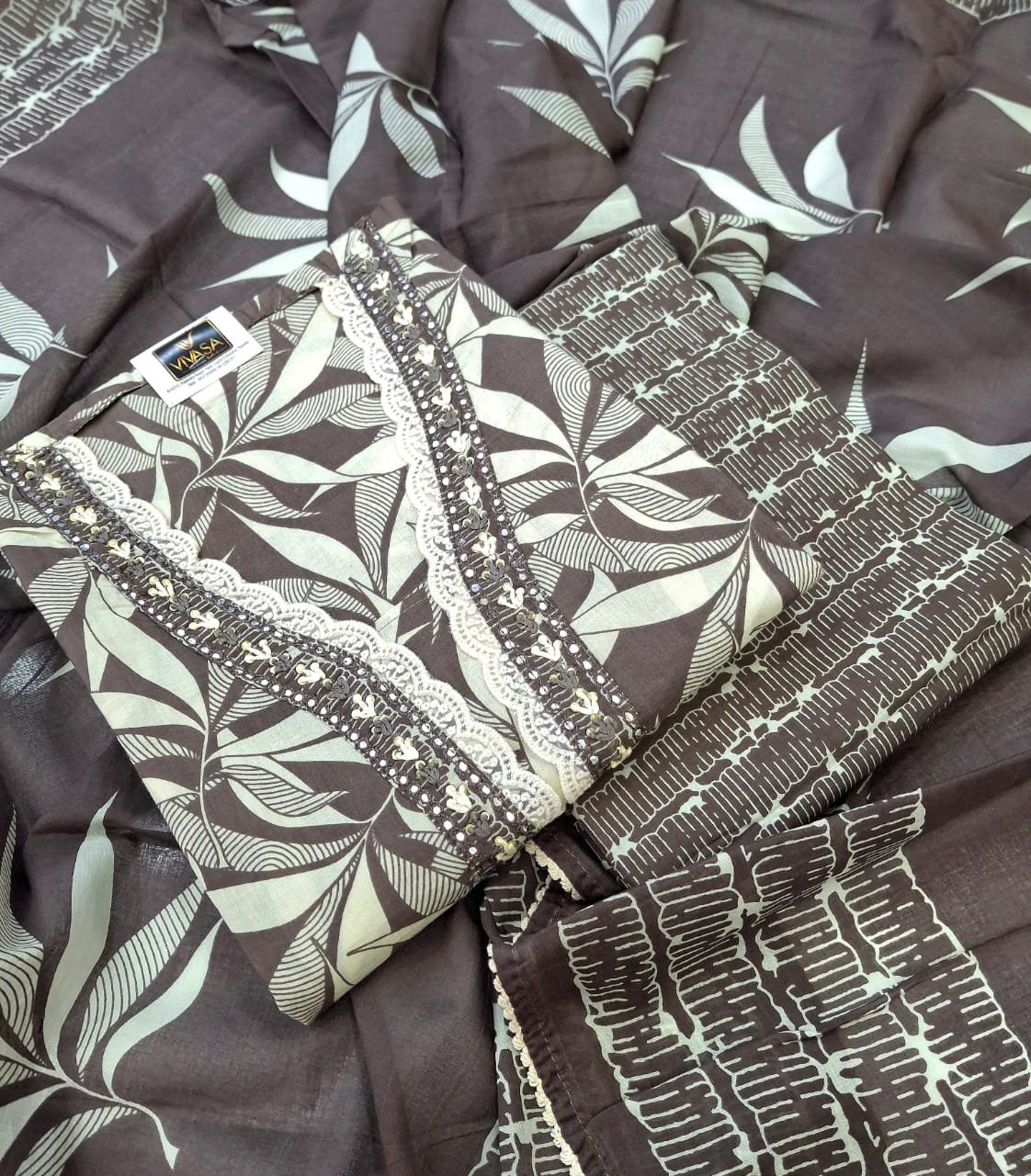 Pure Cotton printed and Y style lace work neck suit with printed cotton bottom and printed cotton dupatta.