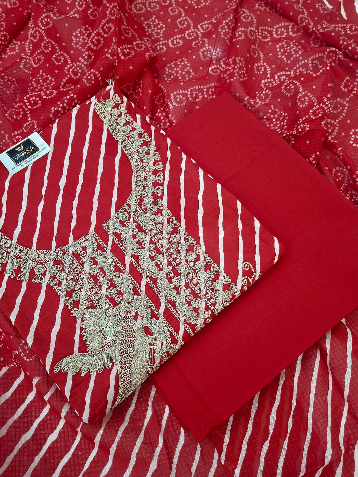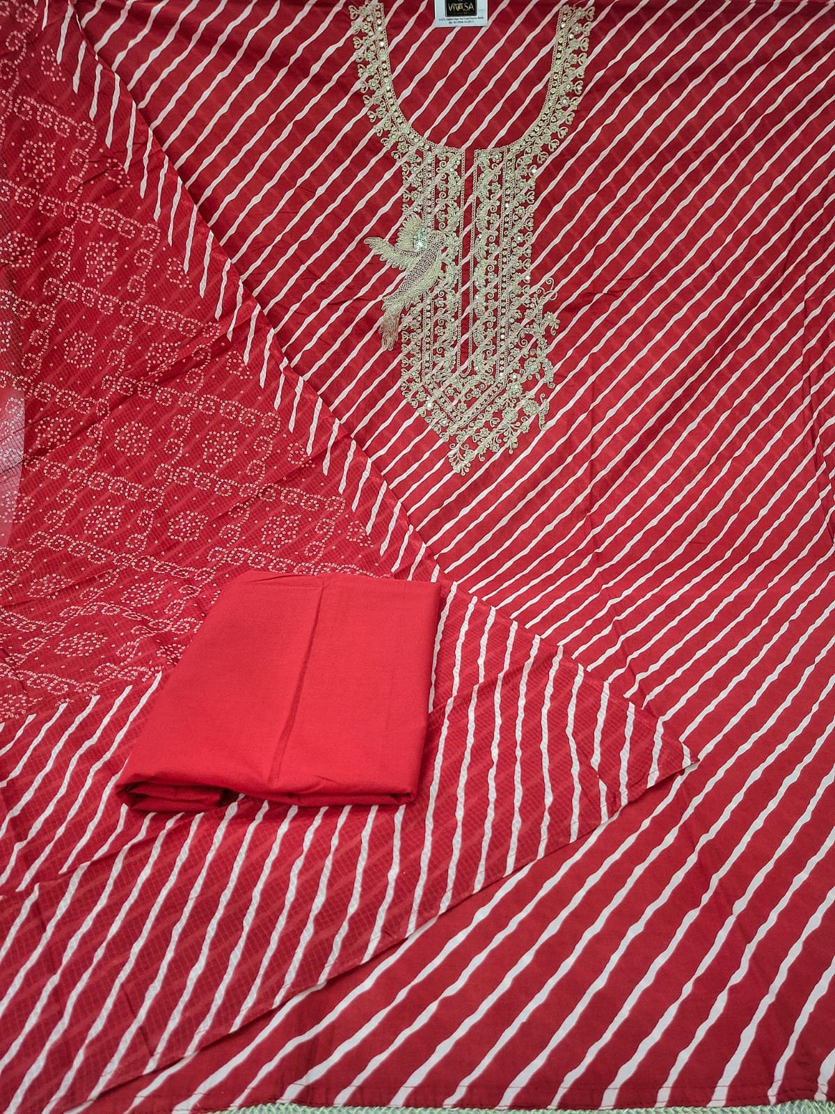 Pure Cotton neck hand embroidery work lehariya design printed suit with cotton dupatta and cotton bottom.
