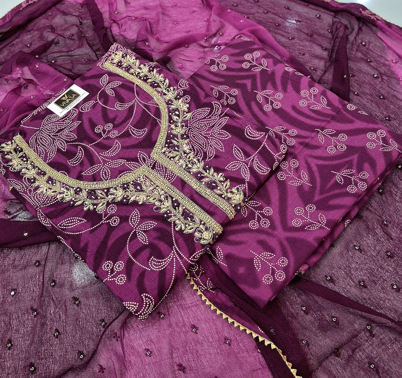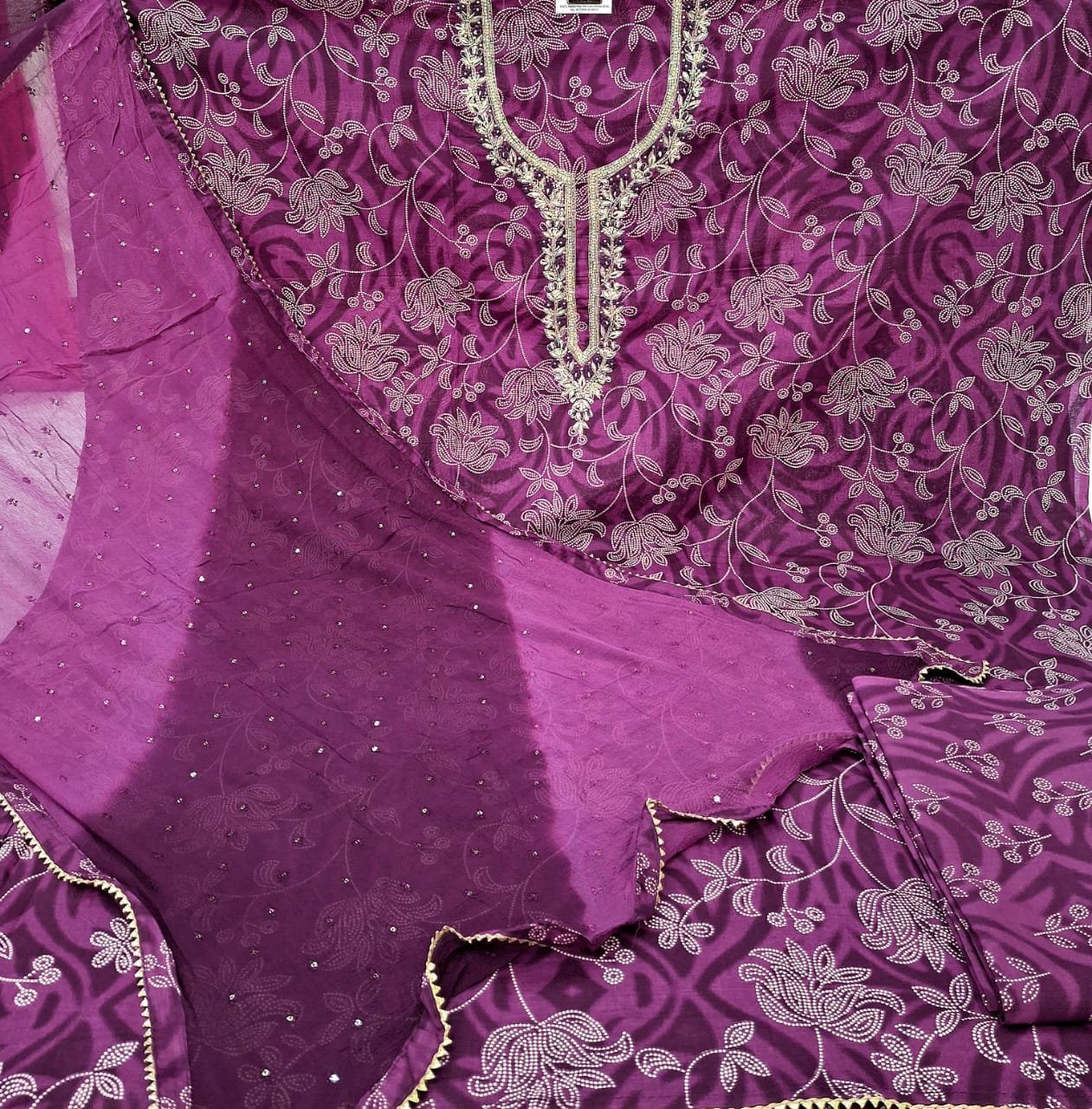 Pure cotton neck hand embroidery work design suit with digital printed bottom and chiffon dupatta.