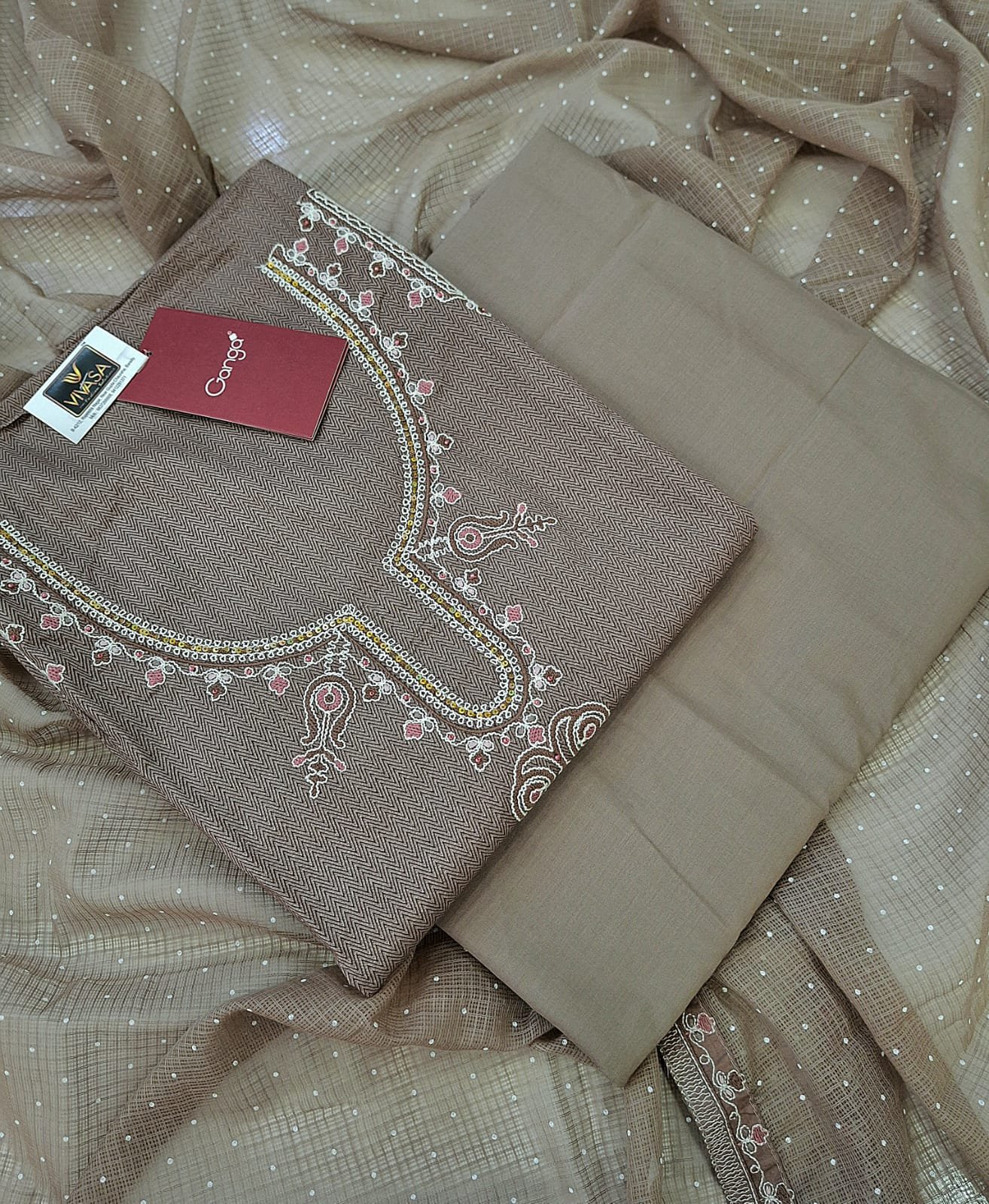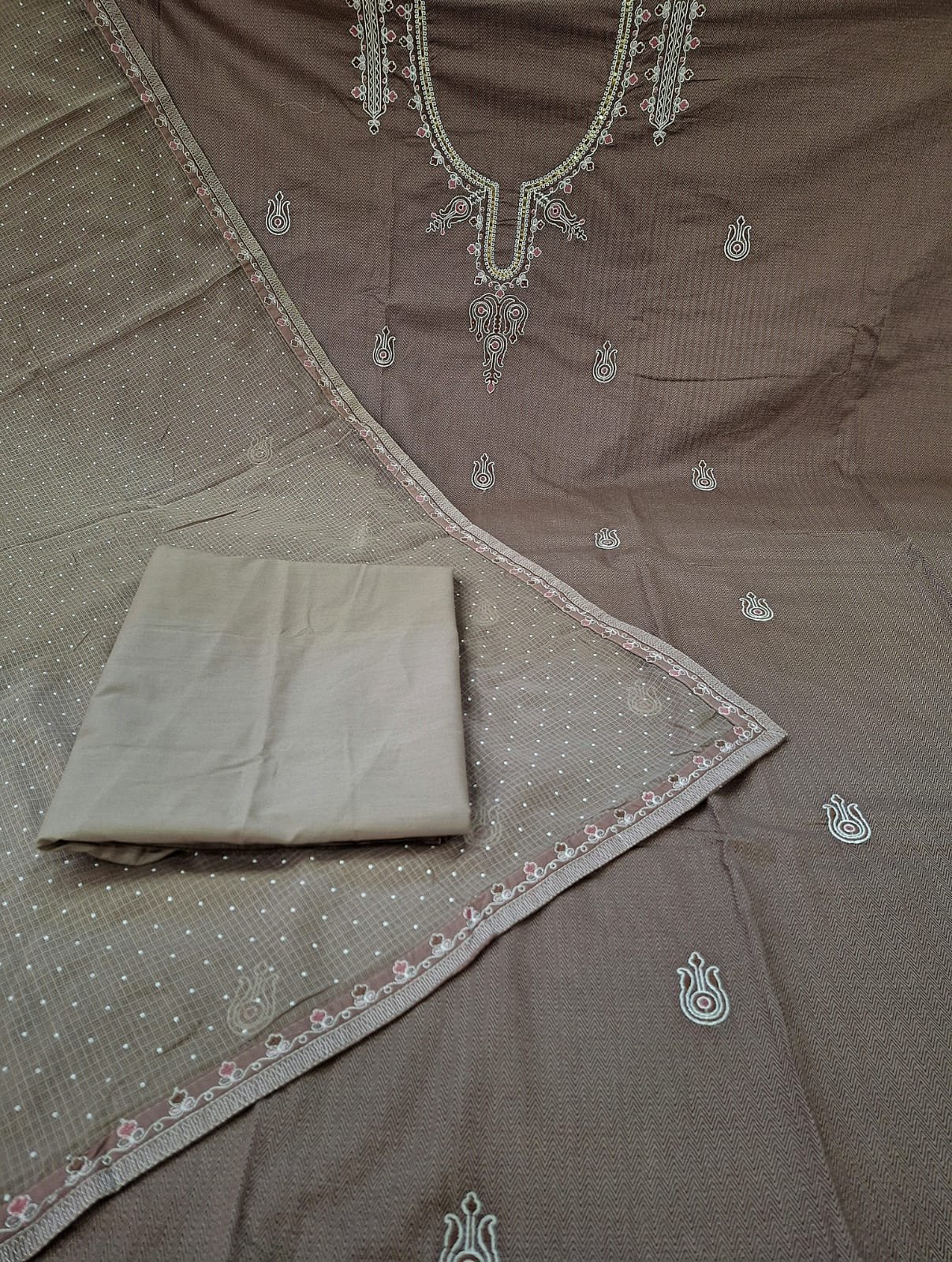 Pure Cotton self print with neck thread work suit with chiffon dupatta and cotton bottom.