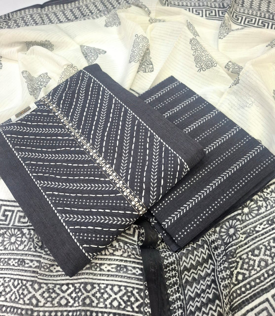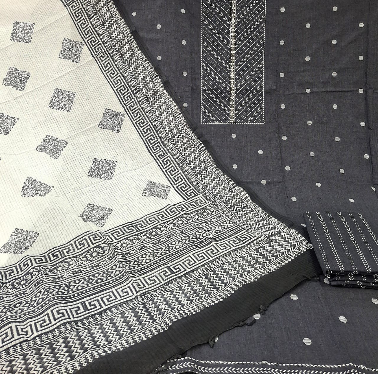 Pure cotton thread embroidery design and printed suit with cotton bottom and contrast fancy cotton dupatta.
