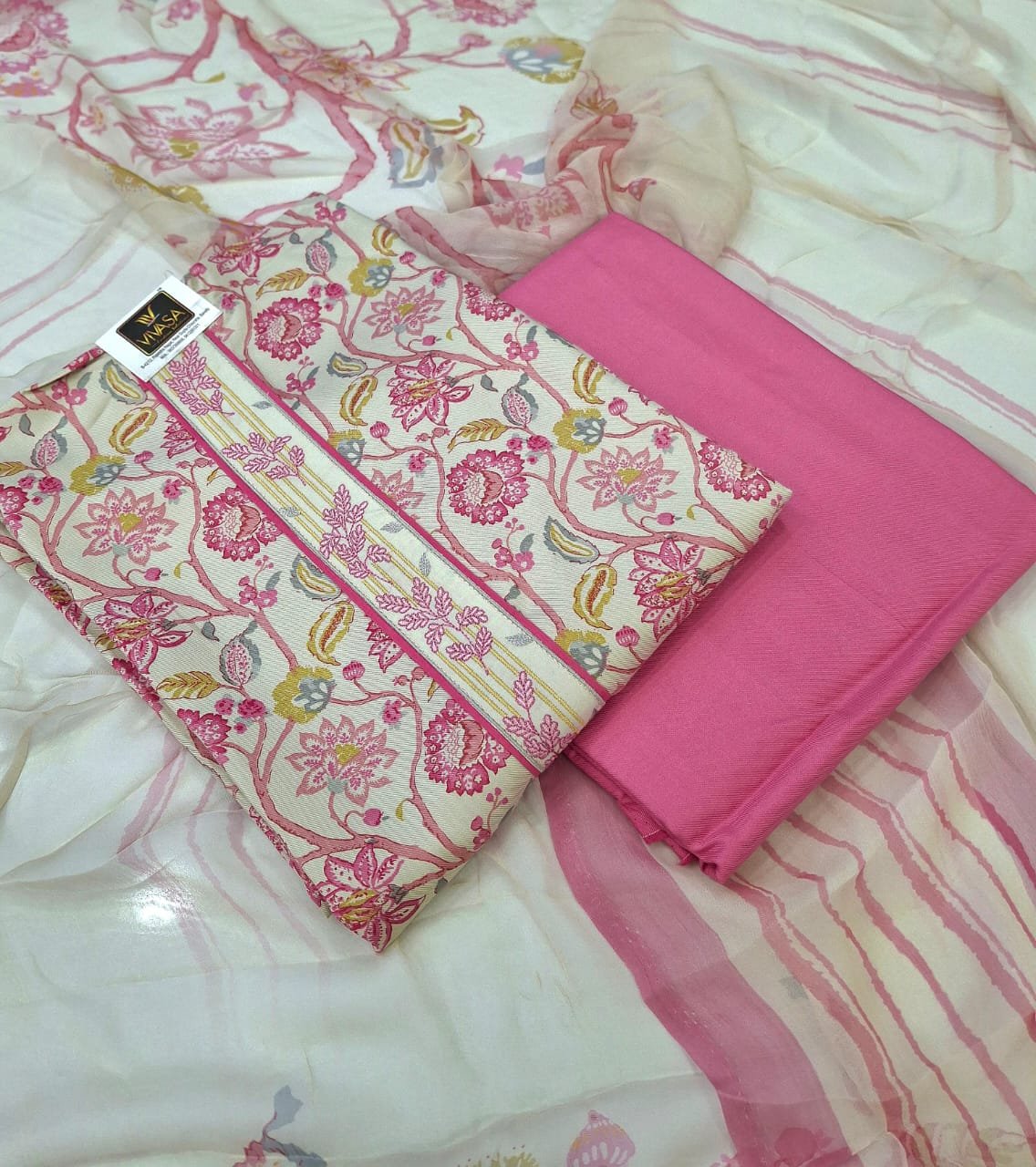 Pure Pashmeena woollen printed suit with plane bottom and pure chiffon dupatta.