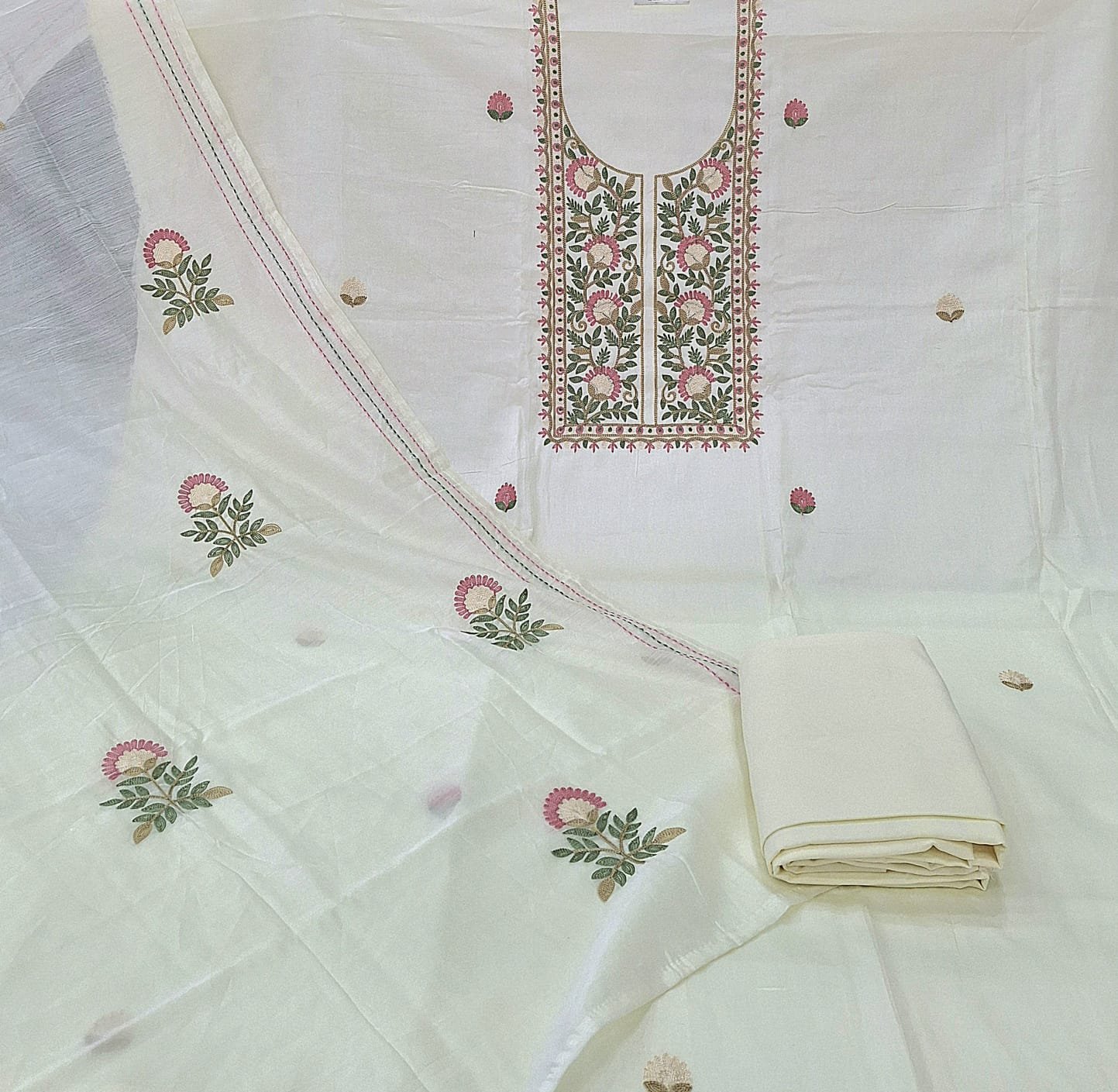 Pure cotton multicolour resham embroidery work suit with cotton bottom and fancy resham work dupatta.