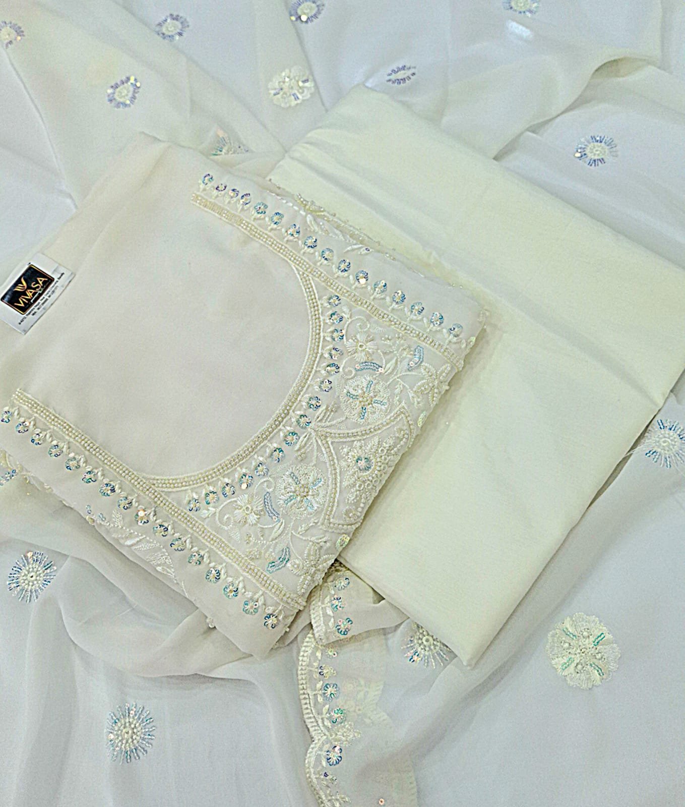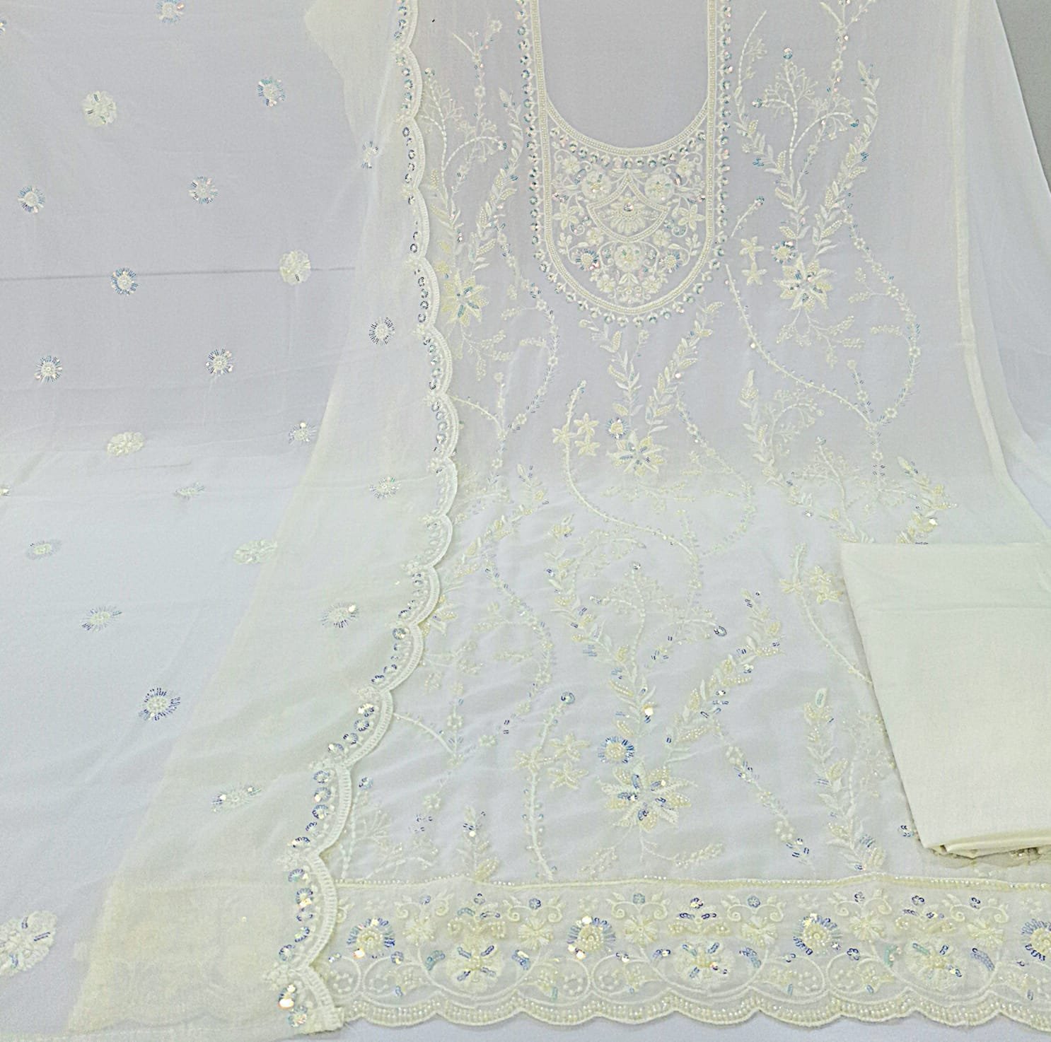 Pure georgette lucknawi work + chiffly work and hand embroidery work suit with cut work daaman and cut work georgette dupatta and plane bottom.