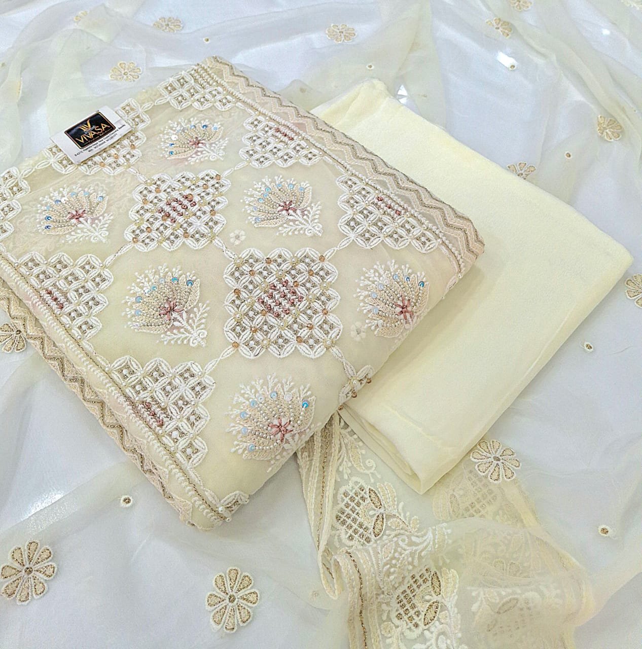 Pure georgette full chiffly work + antique thread embroidery work + tone work suit with pure georgette dupatta and pure silk bottom.