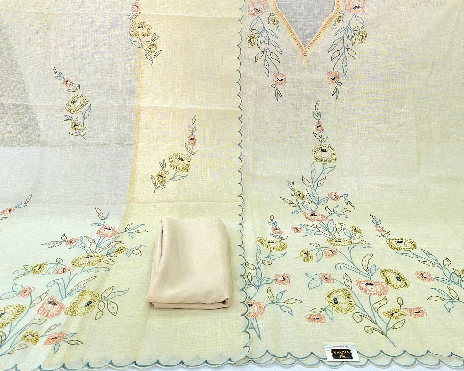 Pure linen fabric printed and kantha work designer suit with linen kantha work cut work dupatta and plane bottom.