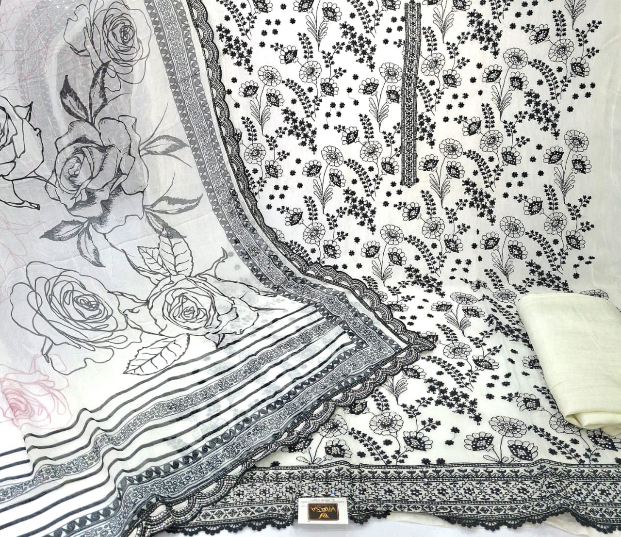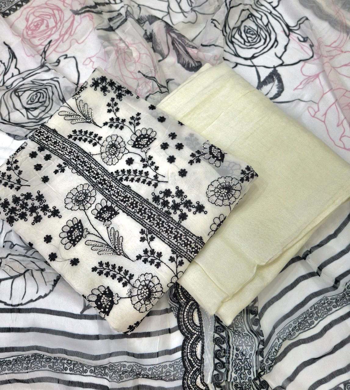 Pure Organza black colour thread embroidery work suit with hand embroidery with plane bottom and chiffon printed cut work dupatta.