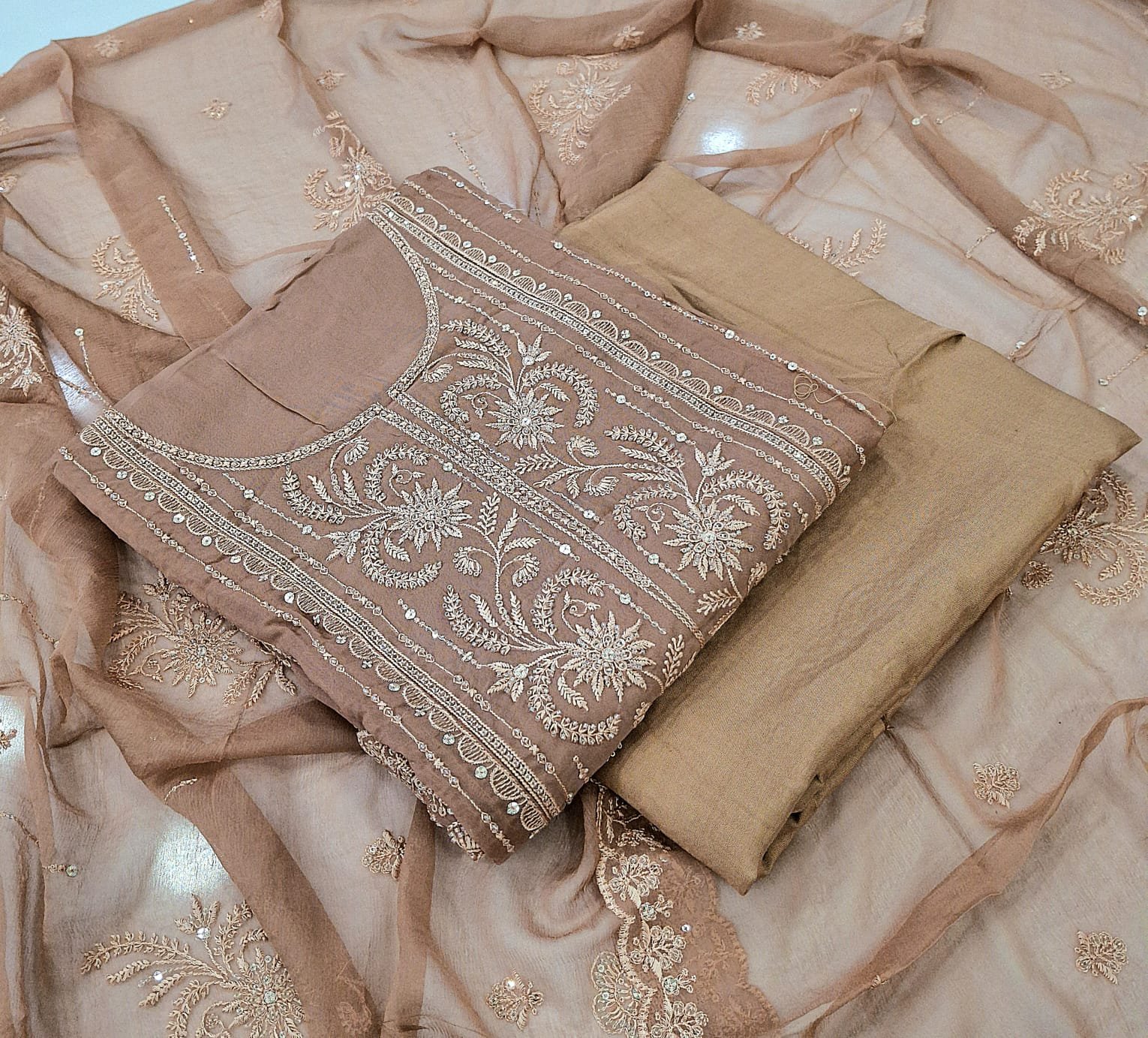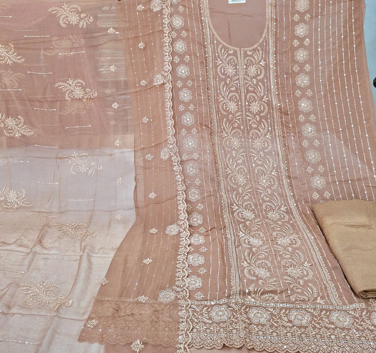Pure organza lucknawi + chiffly work suit with plane bottom and pure georgeette cut work dupatta.