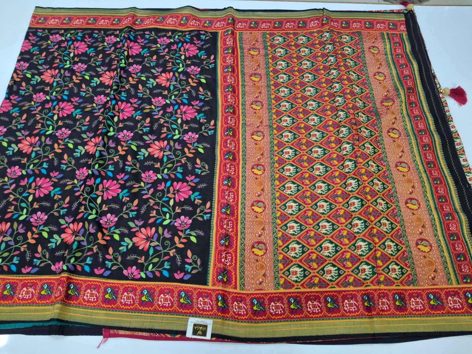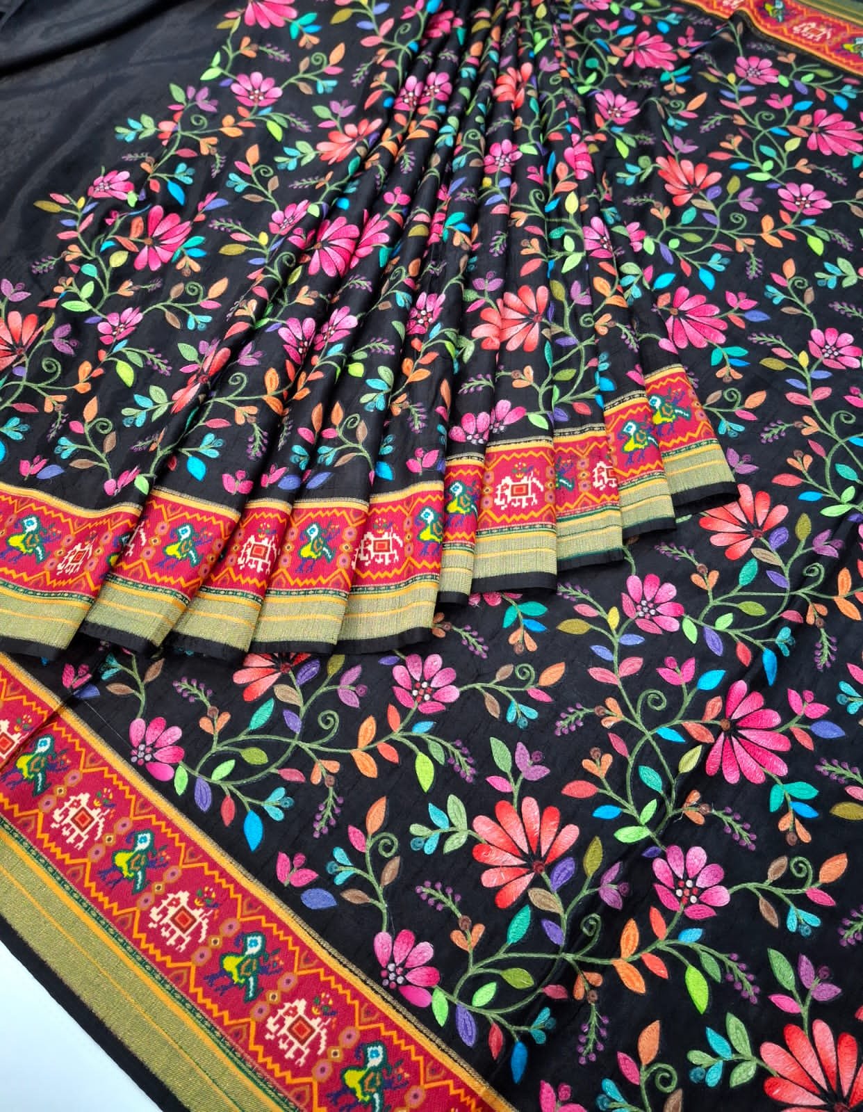 Pure silk fabric exclusive pure resham multicolour embroidery on full saree with patola weaving pallu and patola weaving pure silk blouse.