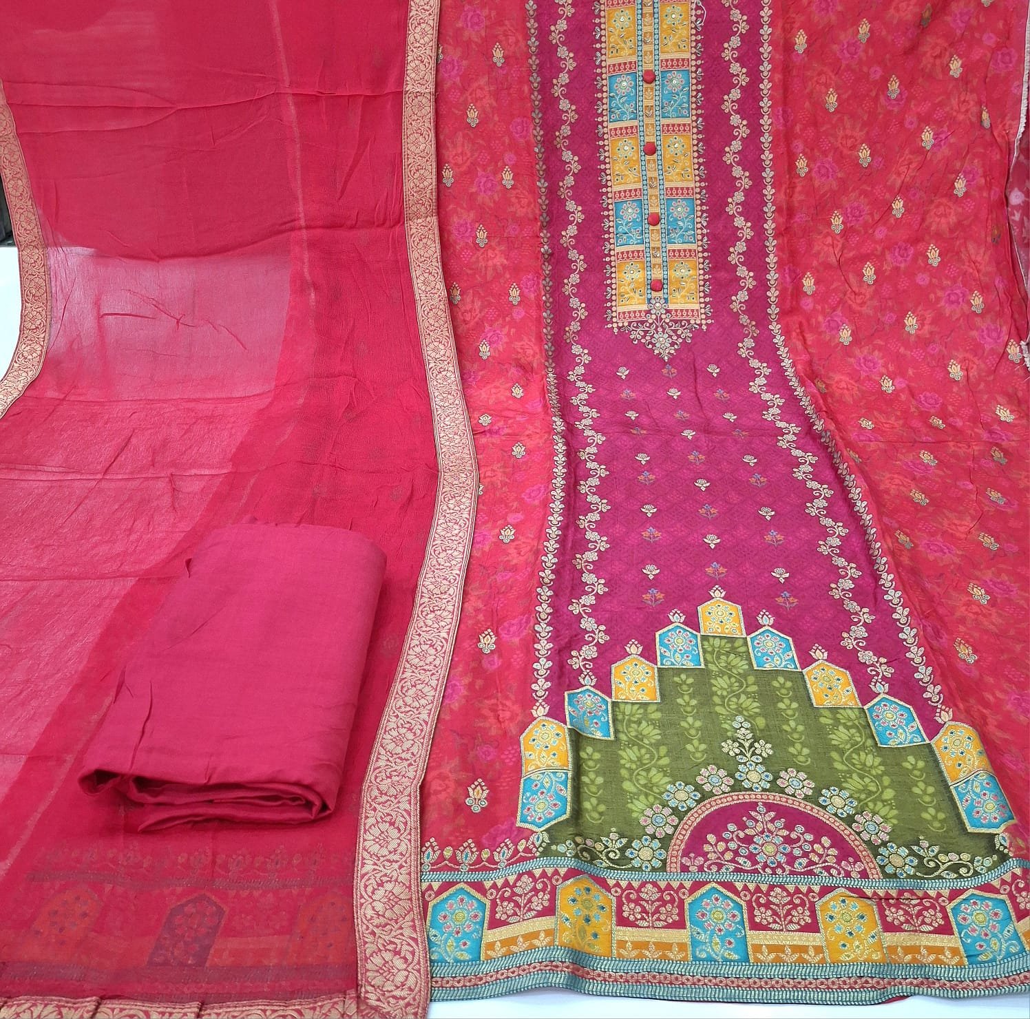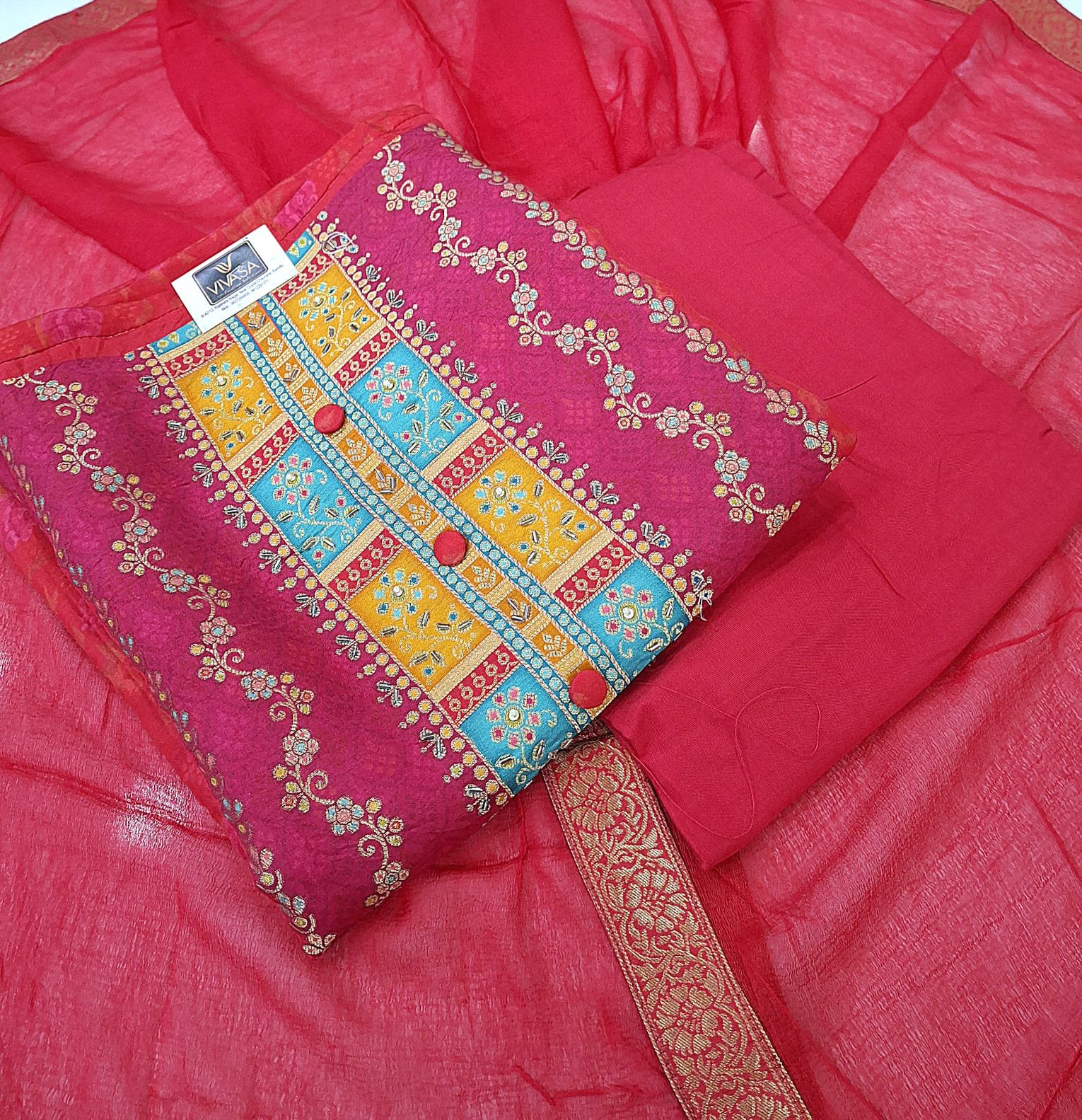 Pure silk weaving design and hand embroidery work suit with plane bottom and chiffon dupatta.