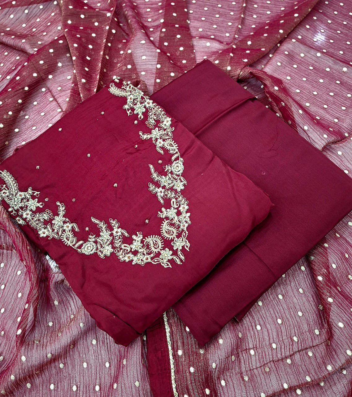 Pure Silk suit with exclusive neck antique embroidery work with plane bottom and crushed chinnon dupatta.