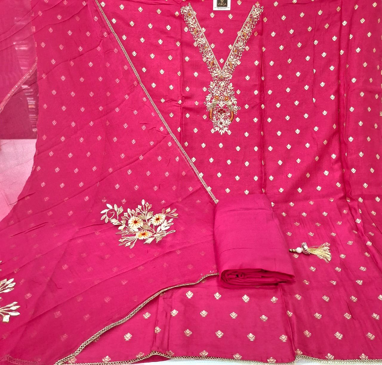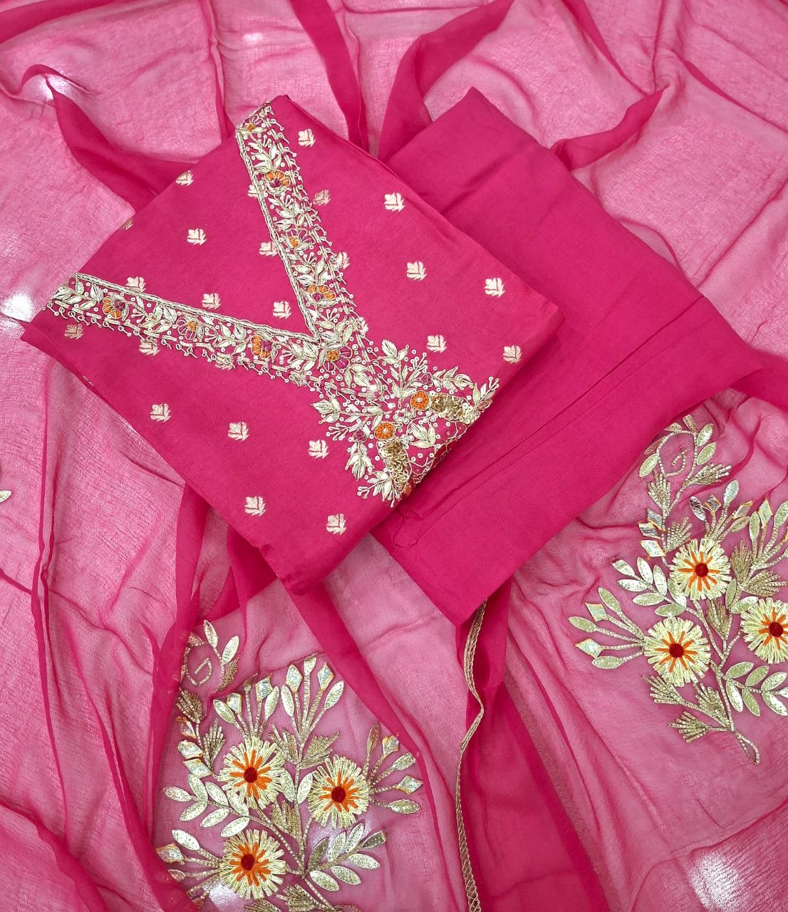 Pure silk V style heavy neck hand embroidery work suit with chiffon gota patti work and plane bottom.