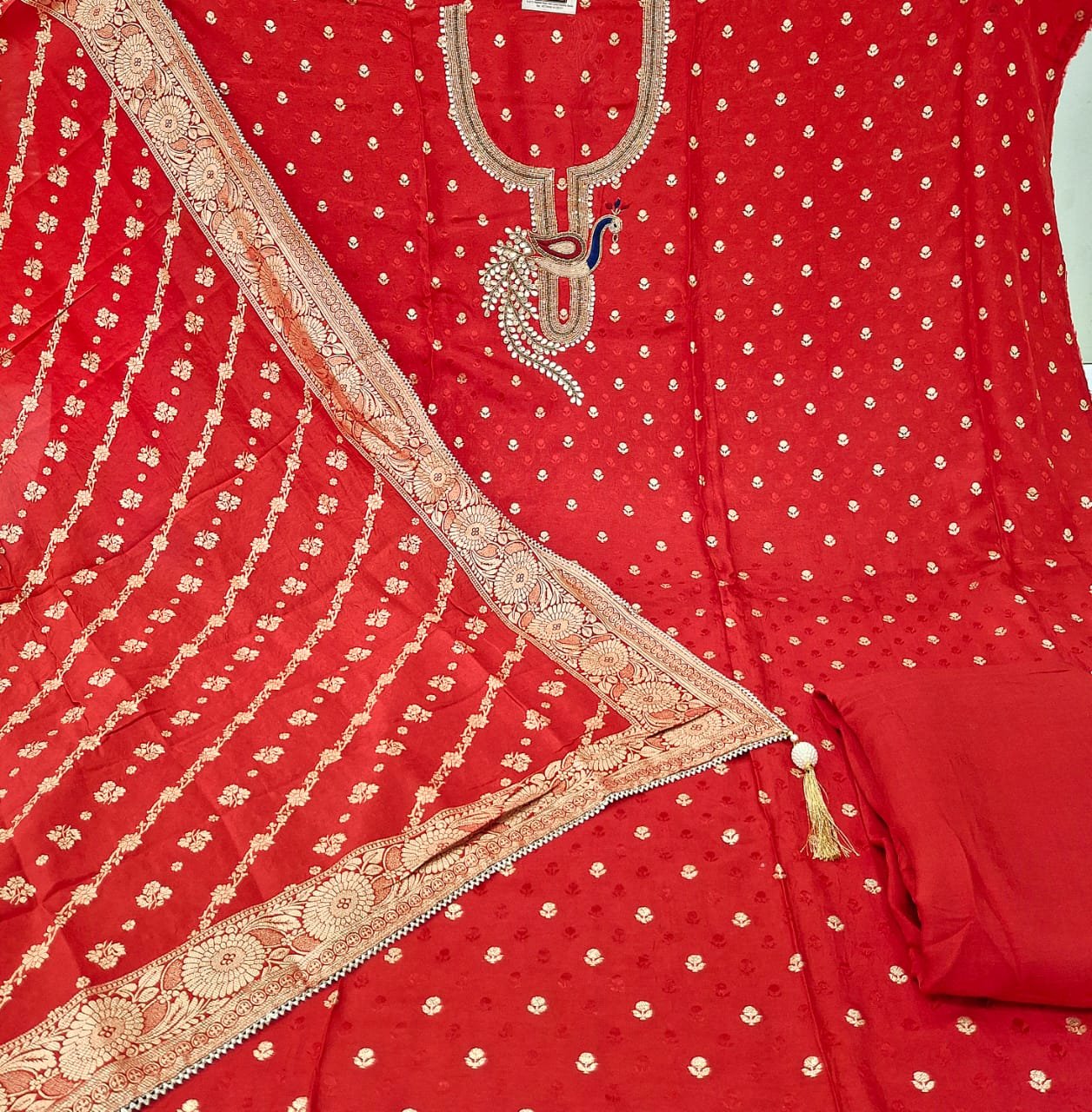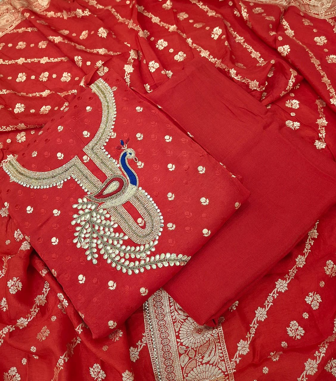 Pure silk suit with neck hand work with mirror work and kundan work suit with designer silk dupatta and plane bottom.