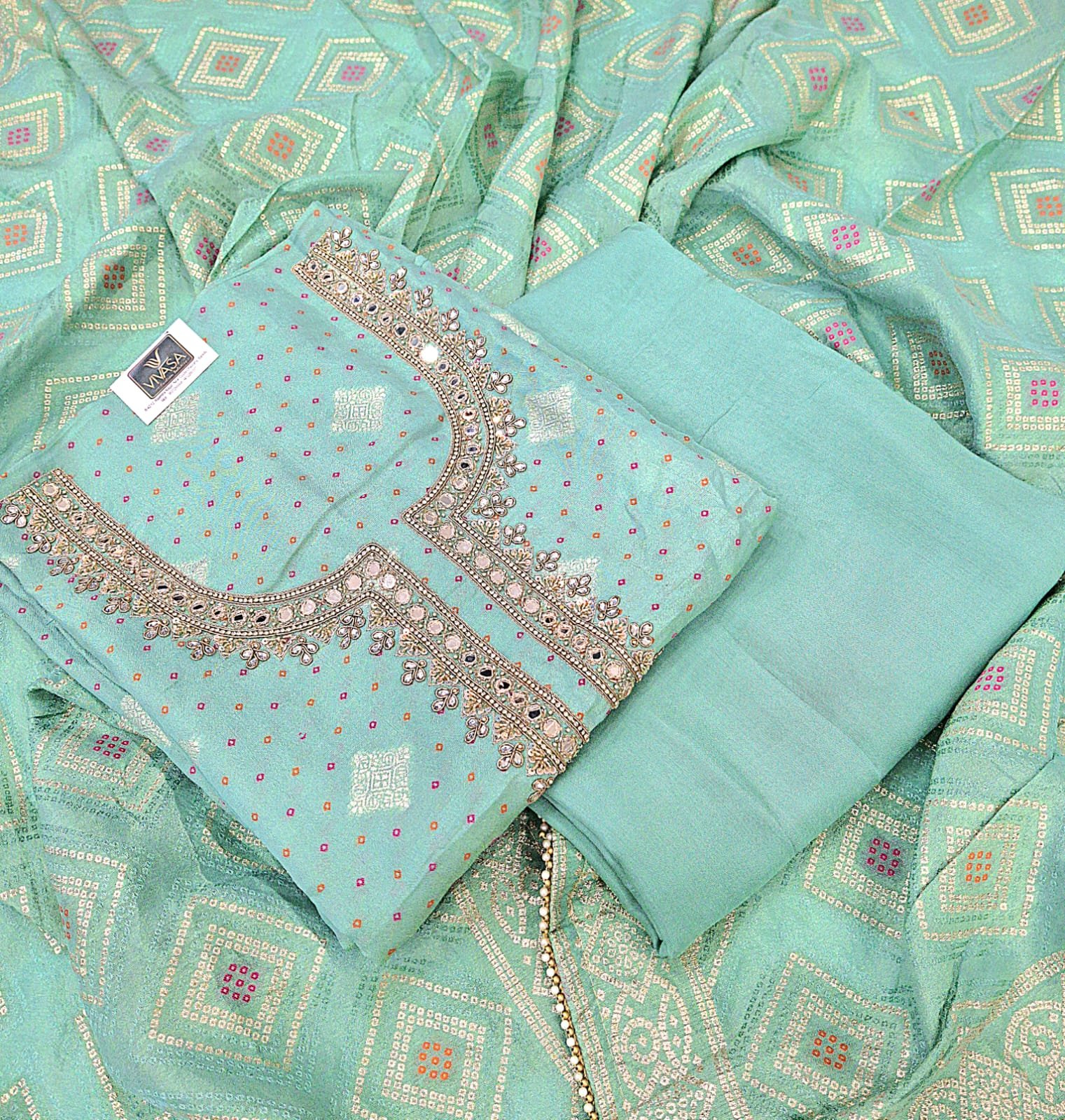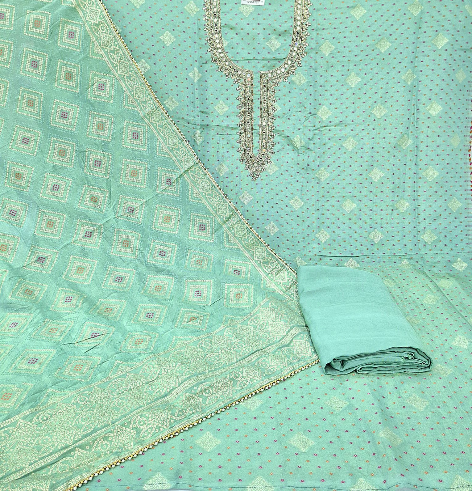Pure silk fabric designer zardozi and ghaat chola design weaving suit with neck total kundan and embroidery work with plane bottom and silk dupatta.